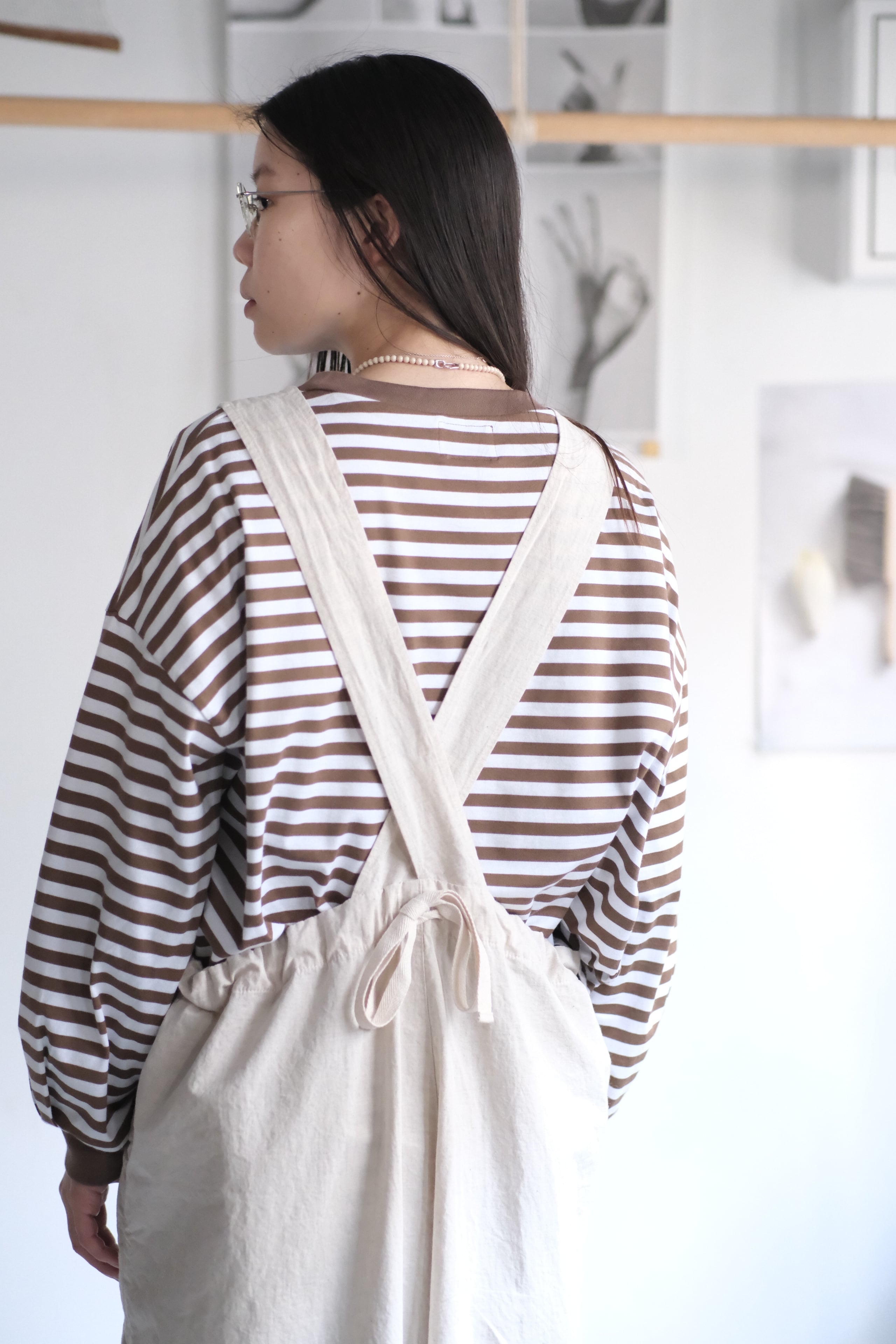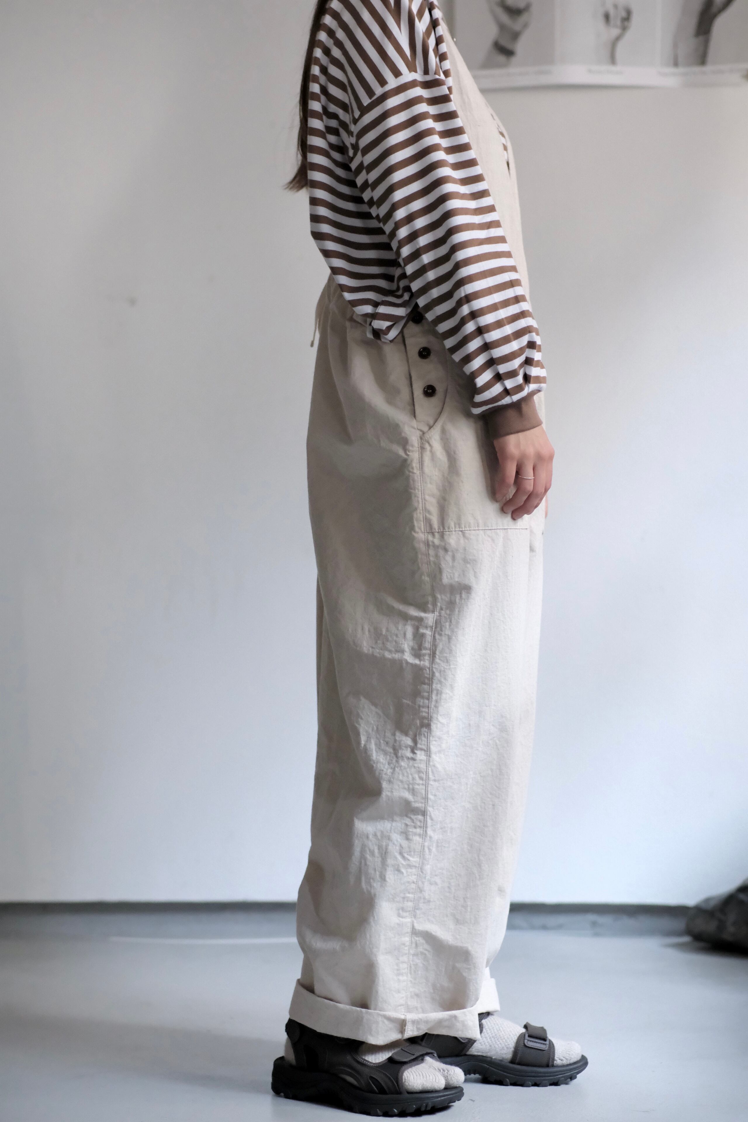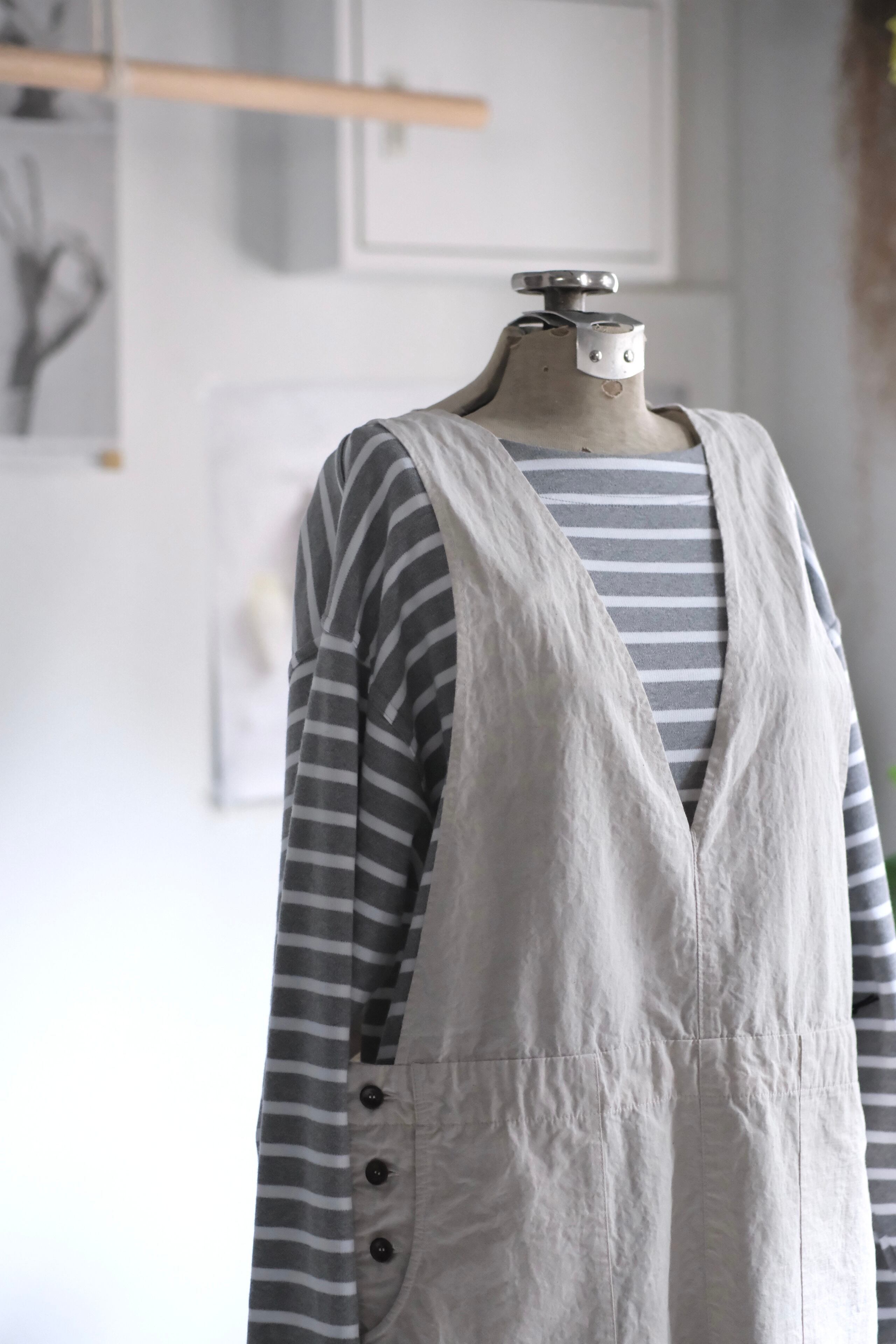 フロント深めのVデザインにしたゆったりストレートシルエットのサロペット。