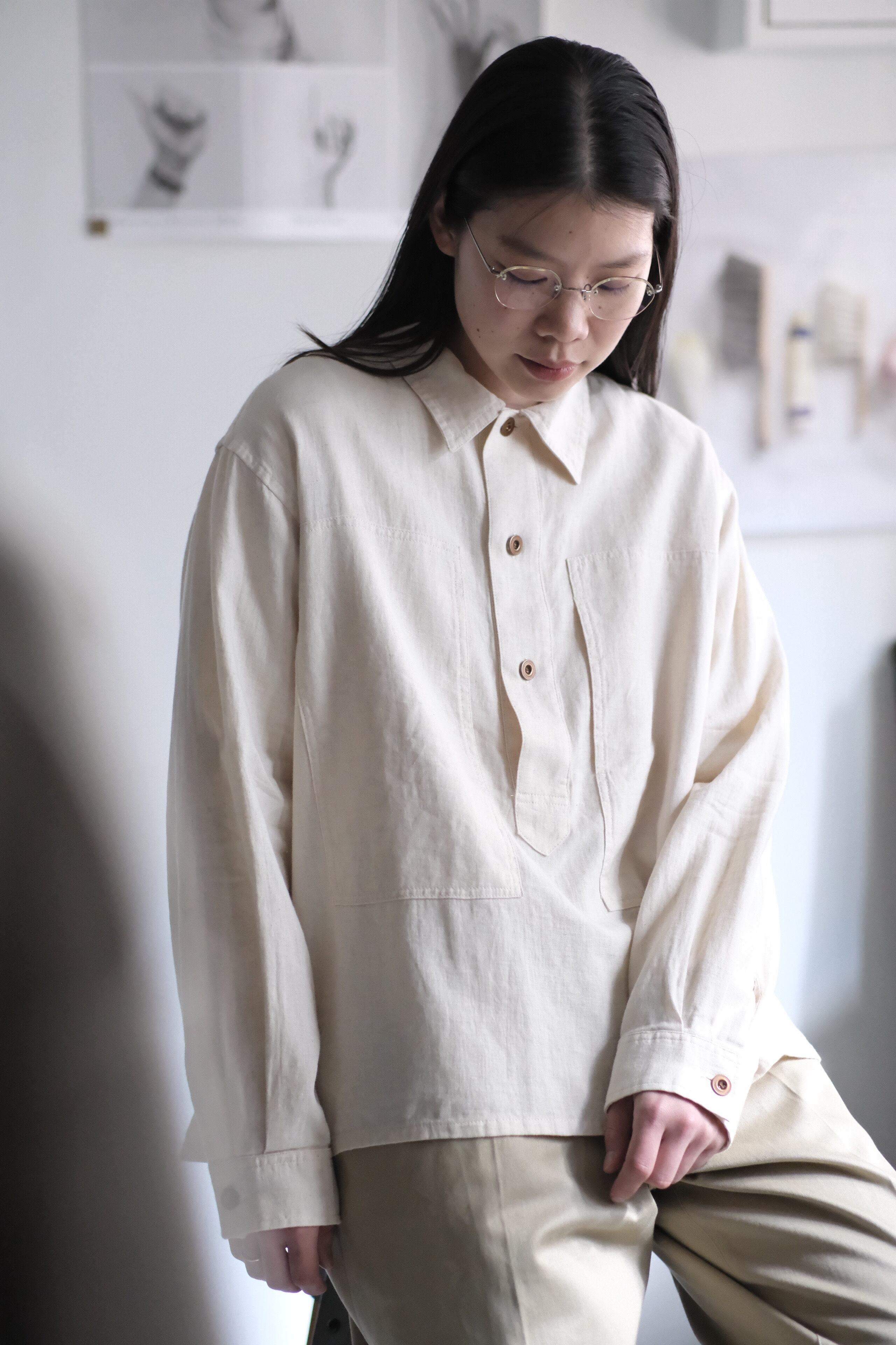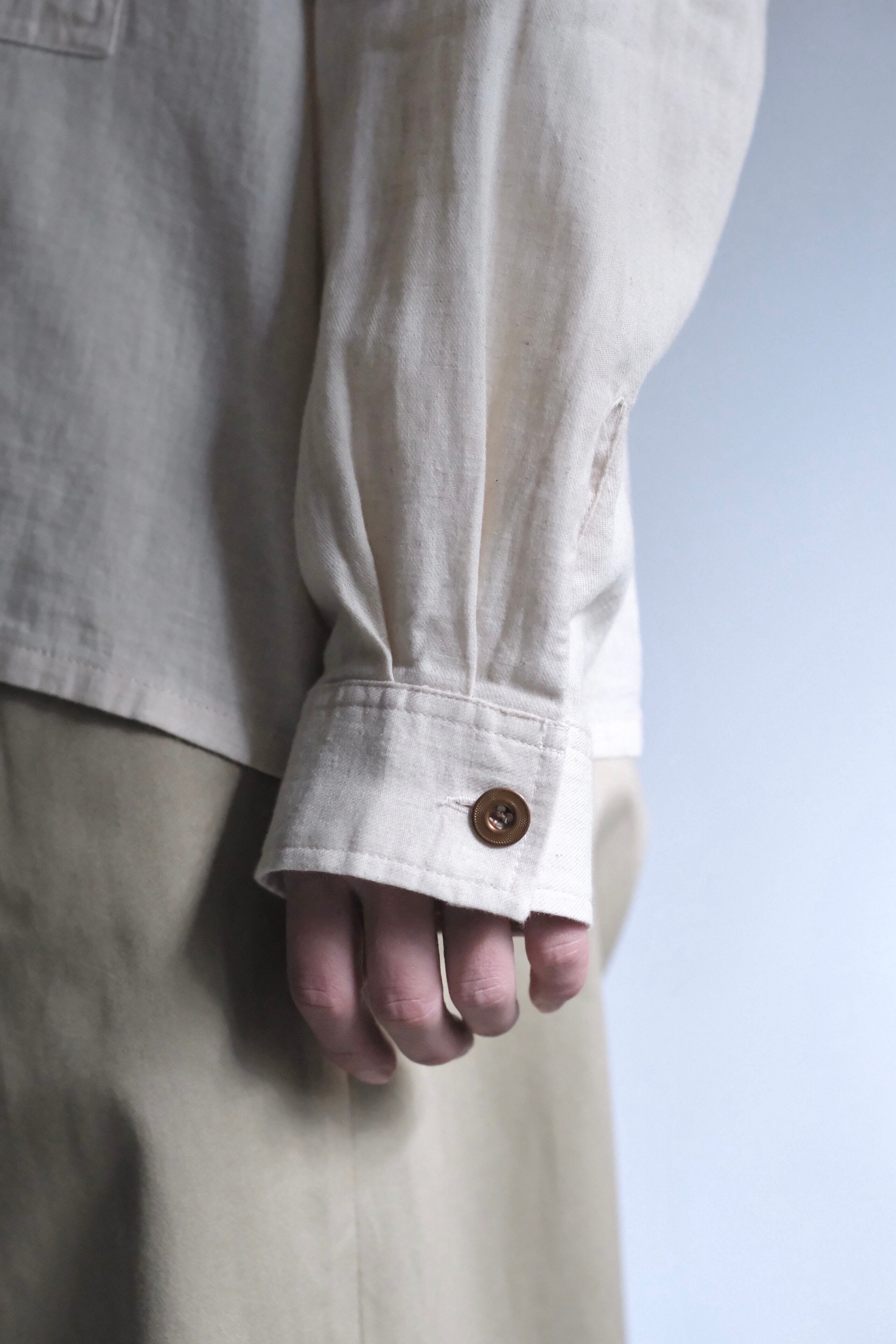 生地は綿麻のライトな物を使用していますが、メタル釦を採用することにより、どこか無骨な雰囲気を持った仕上がりとなっています。