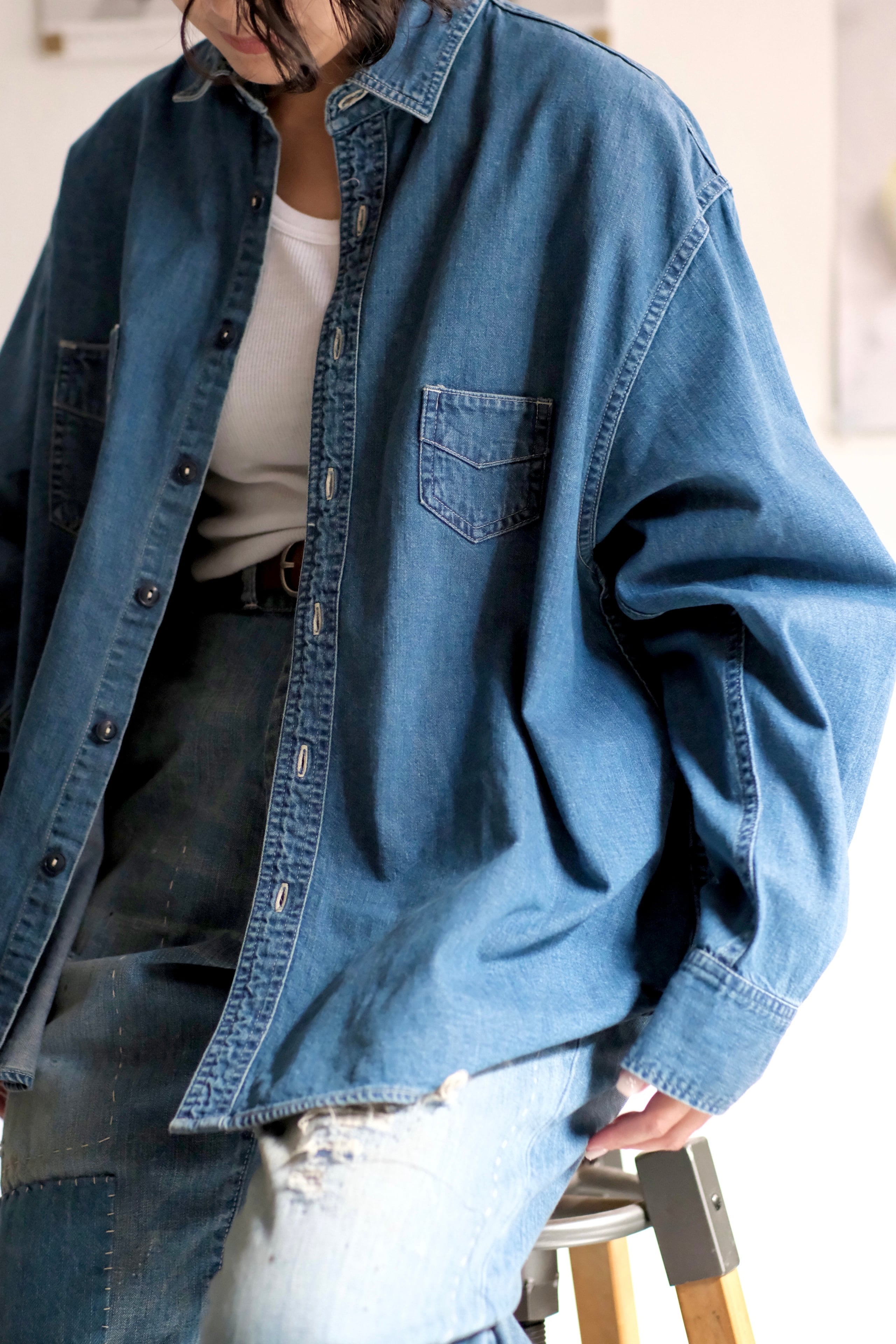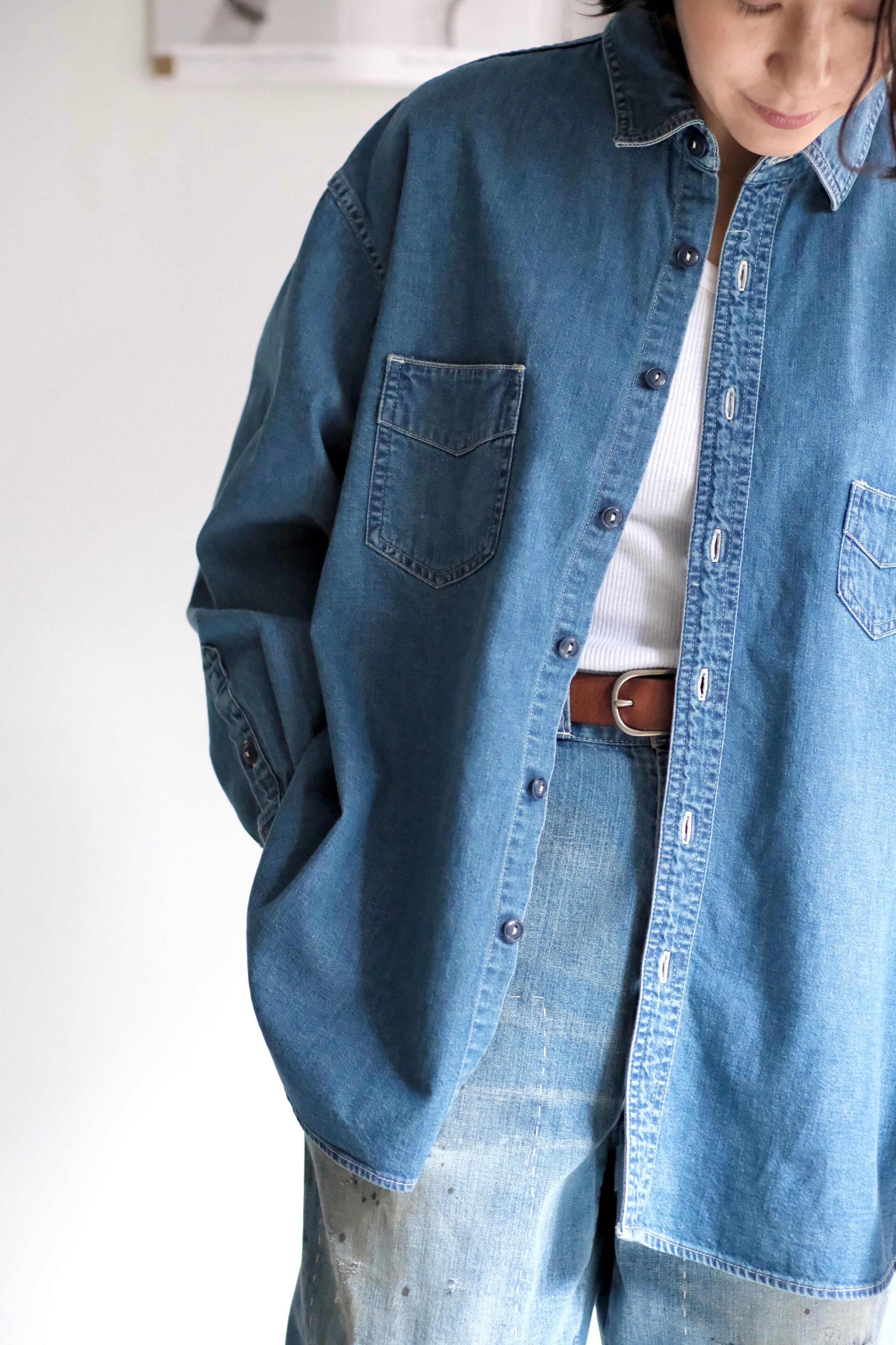 アシンメトリーな胸ポケット、小さ目な襟などヴィンテージワークシャツのディテールを採用し、クラシカルな雰囲気を持たせたリラックスシルエットのデニムシャツ。