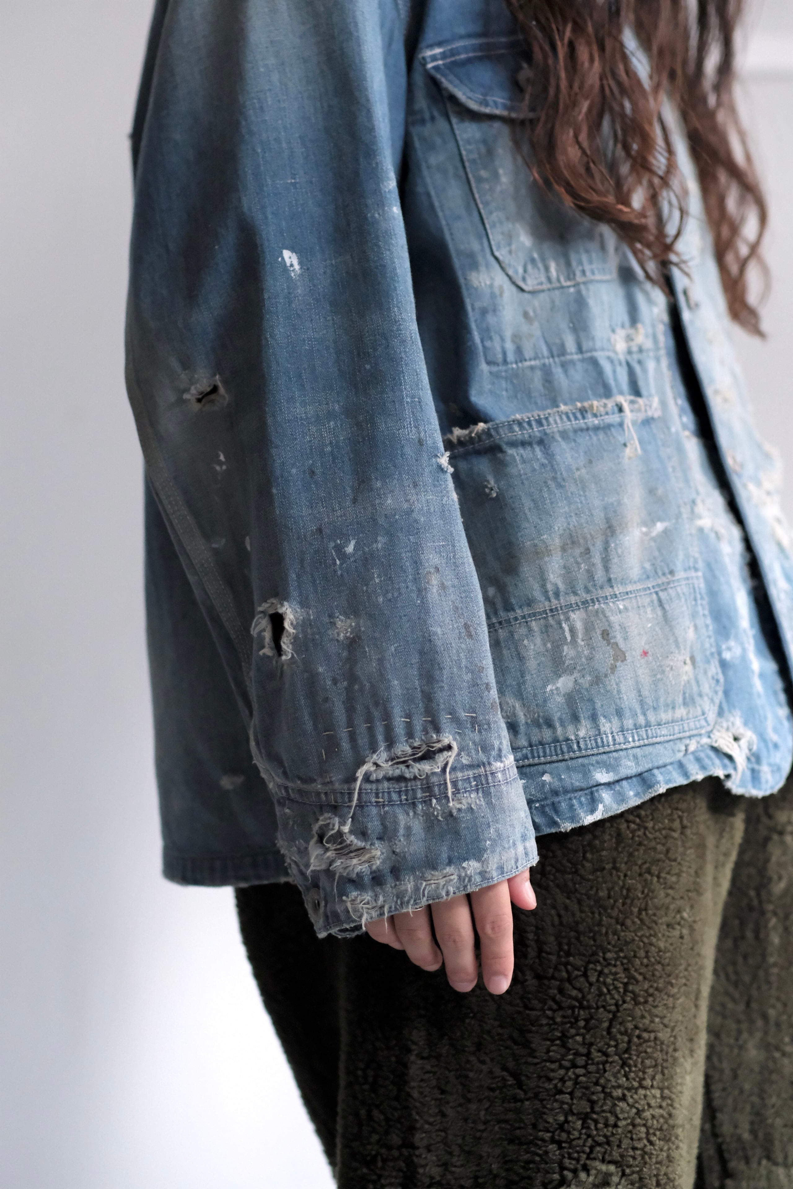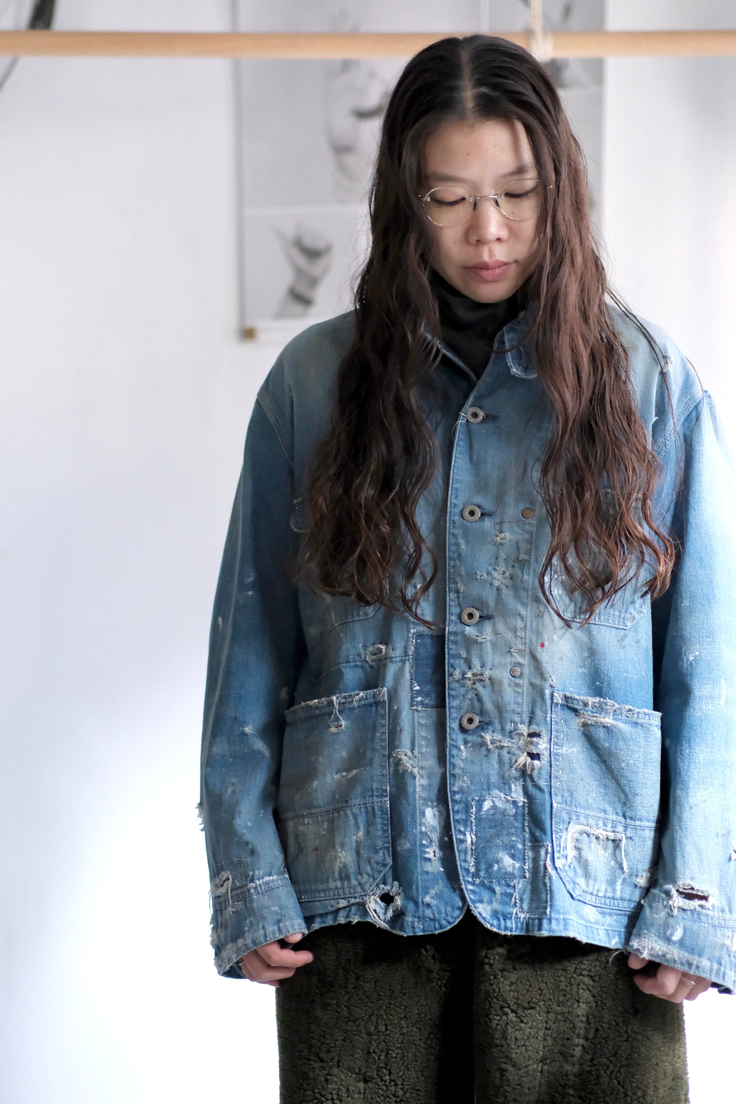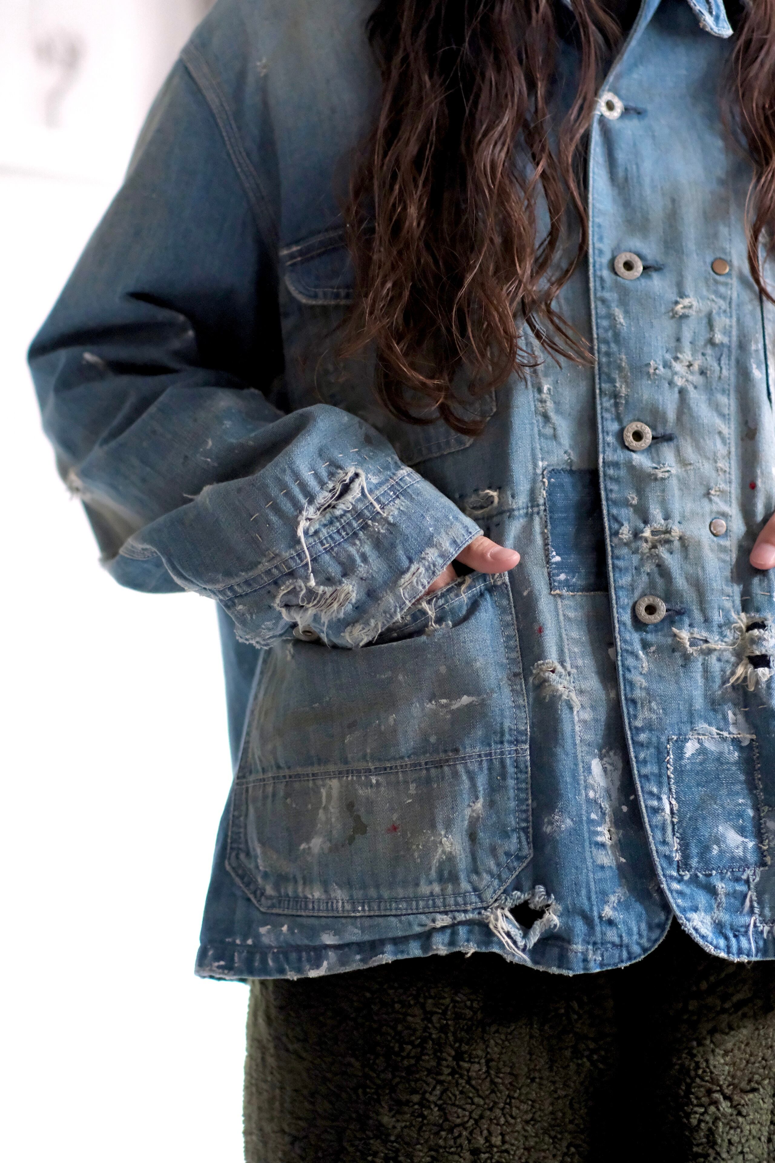 ダメージ加工やペンキ汚しを施し、ハンドステッチや当て布をプラスし、長年着古したようなイメージのカスタマイズを施しています。