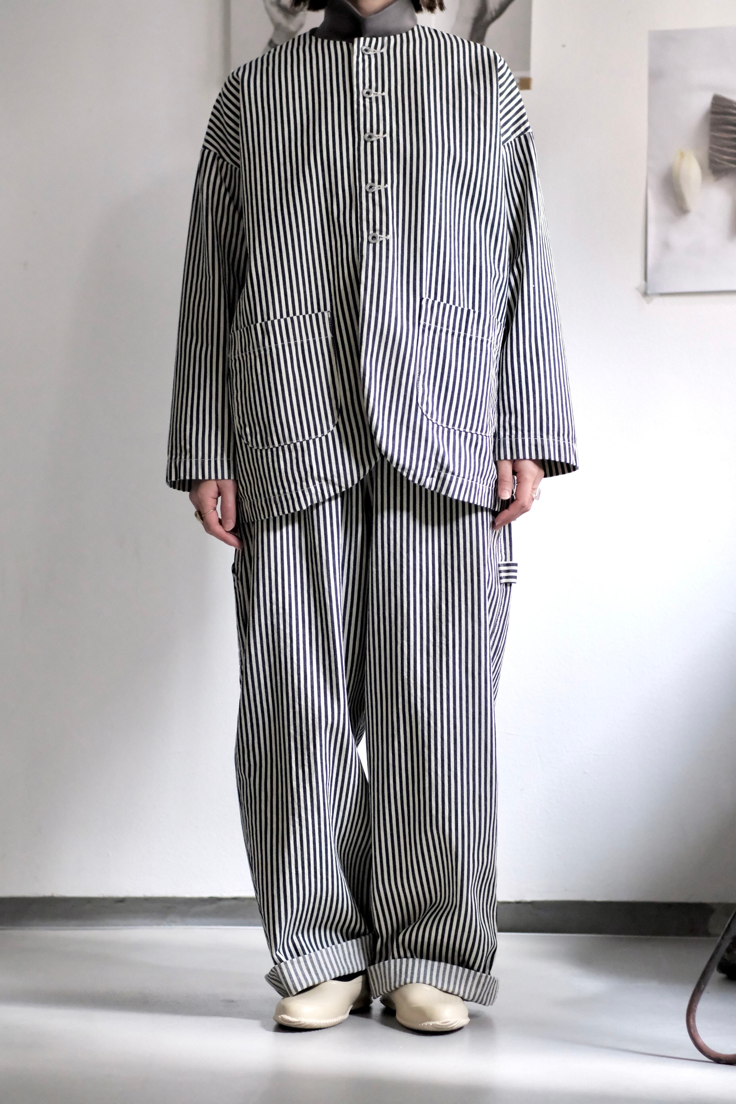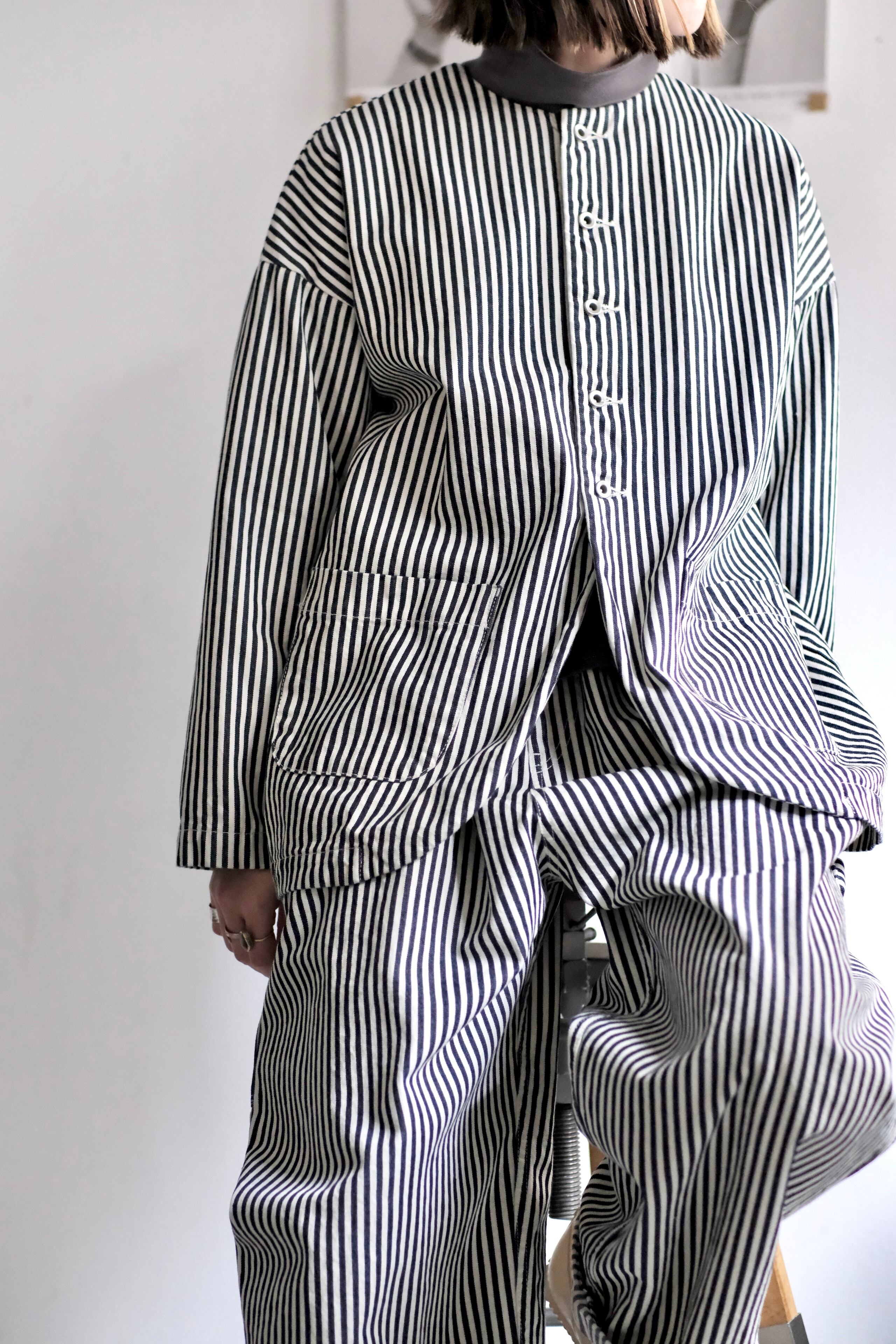 目が粗いカツラギに太ピッチストライプの100zのヒッコリー素材を採用。