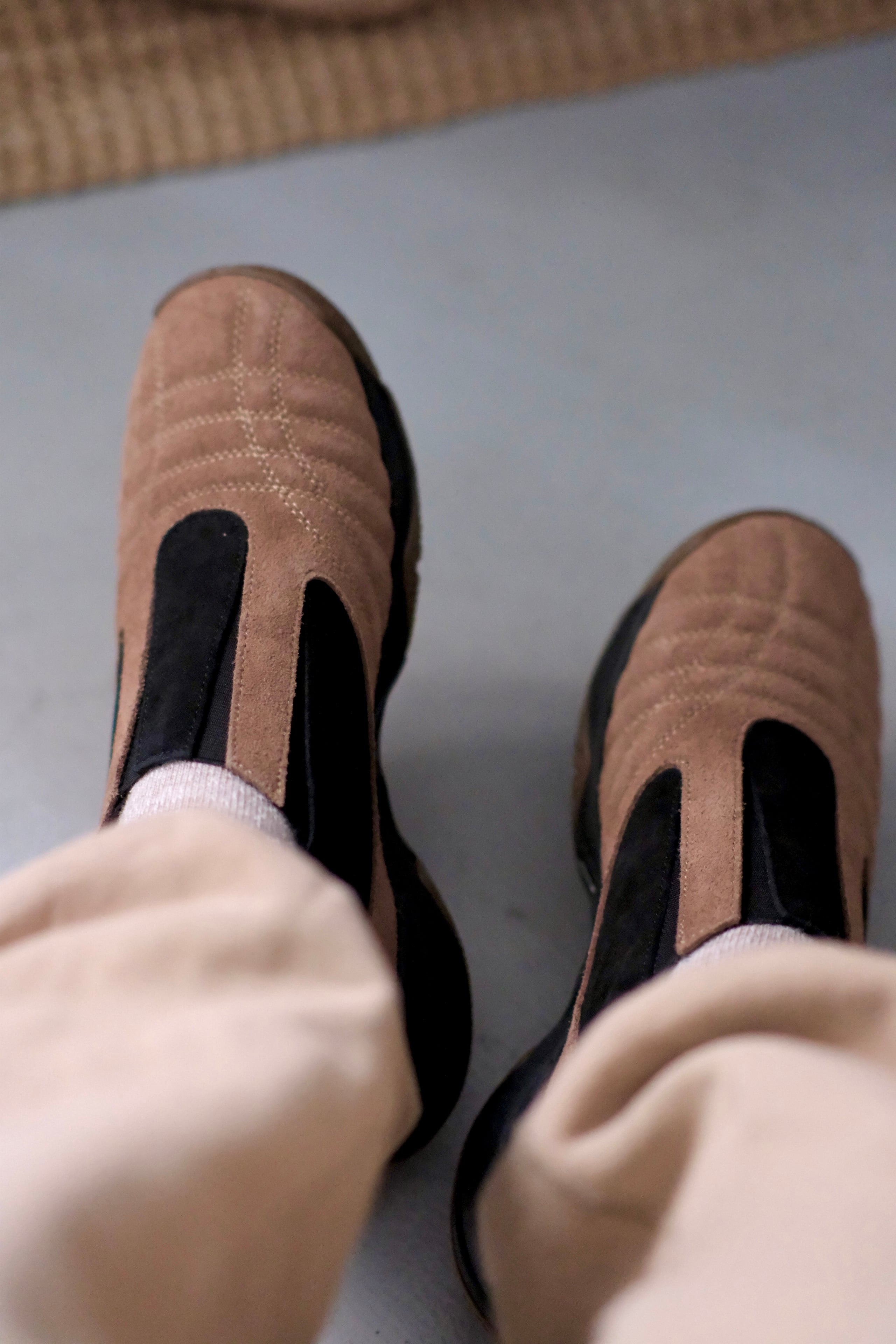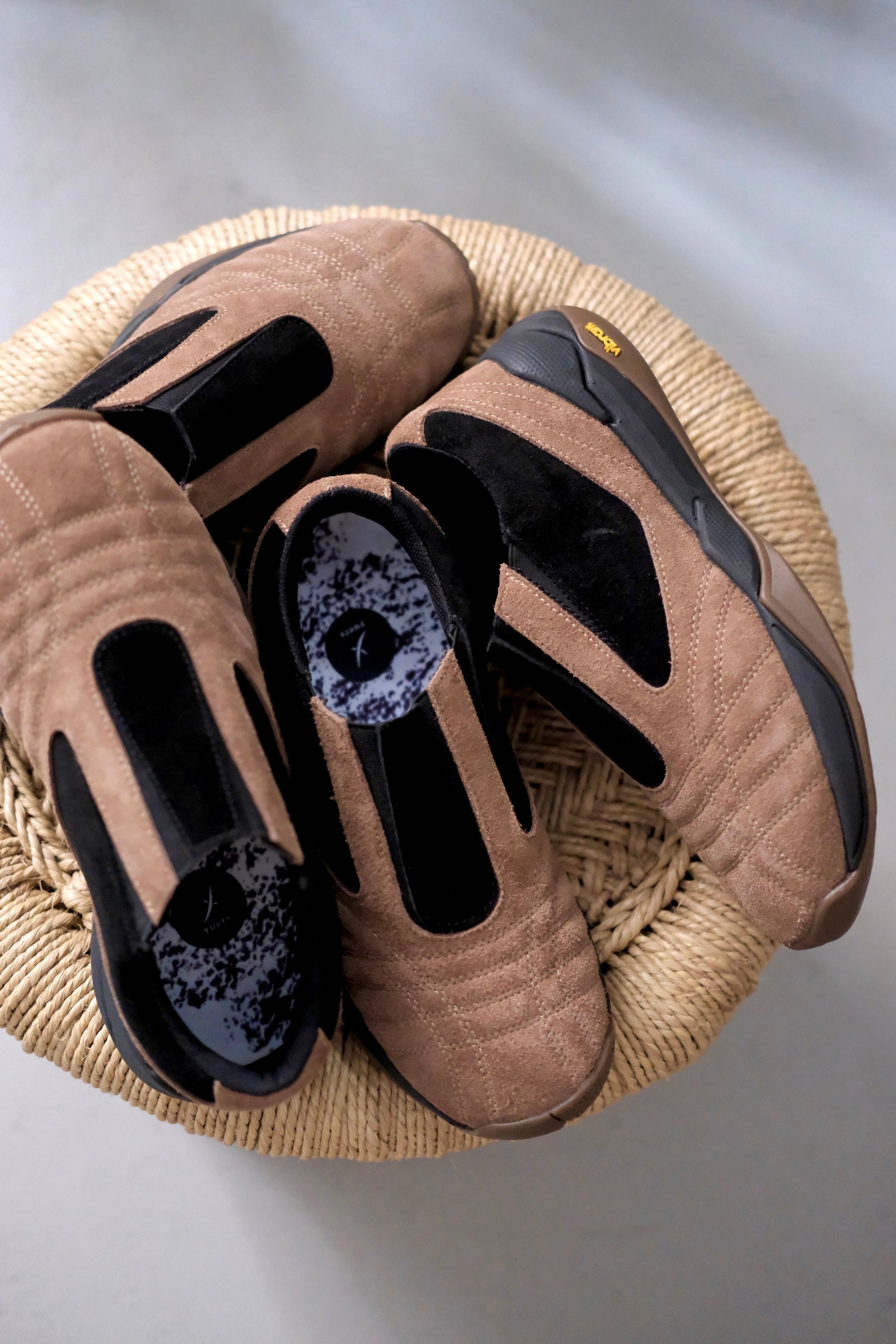 コアなスニーカーマニアに人気のあったスリッポンをベースに、テコンドーシューズに代表される甲のステッチワークでデザインと屈曲面での機能性をプラスすることで、オールレザーながらも"ユーザビリティ"を兼ね備えたスニーカーに仕上げた。