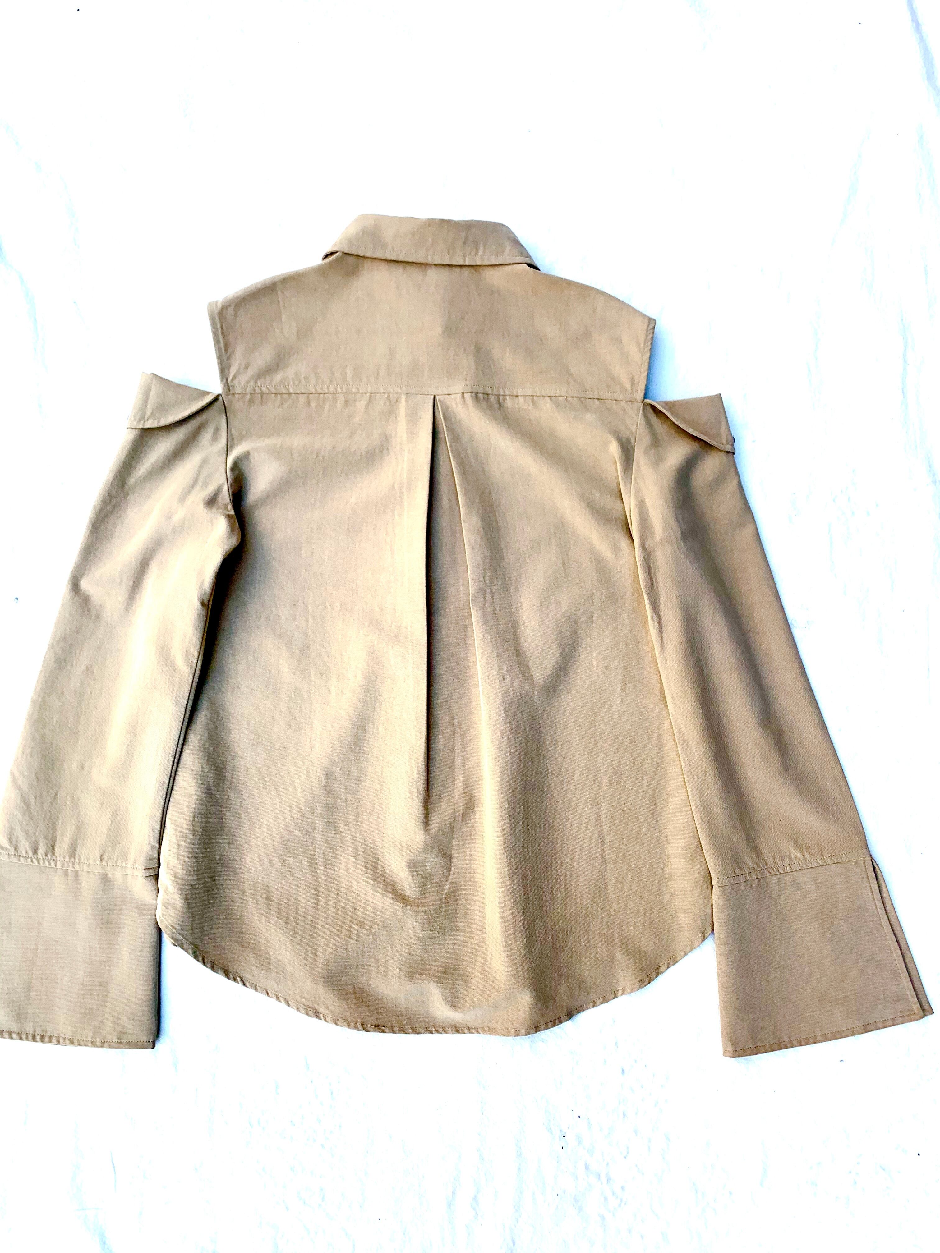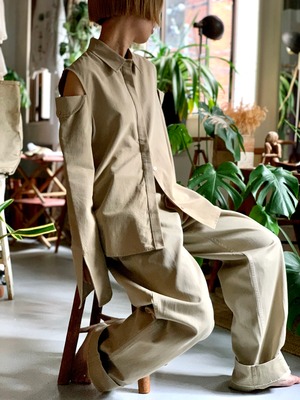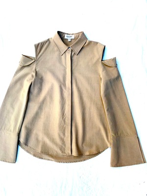カラーはベージュと、シンプルですがフレアスリーブにカットアウト等ディテールが目を惹く1着です。