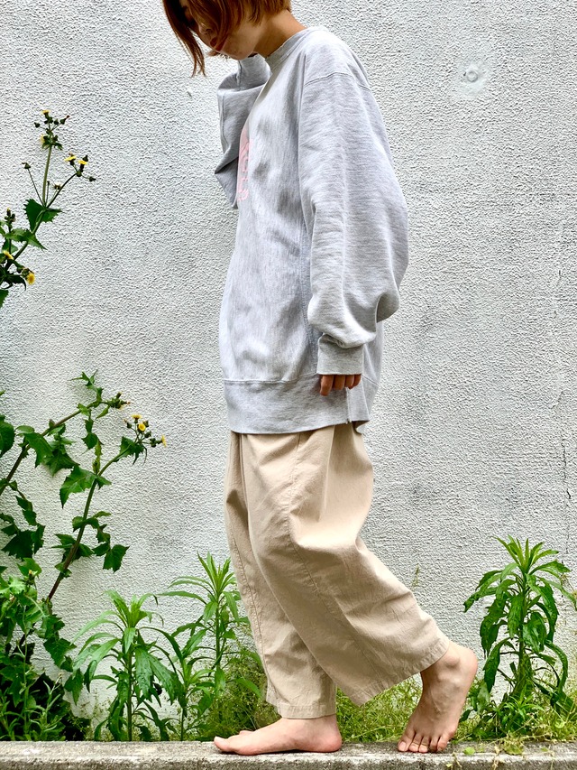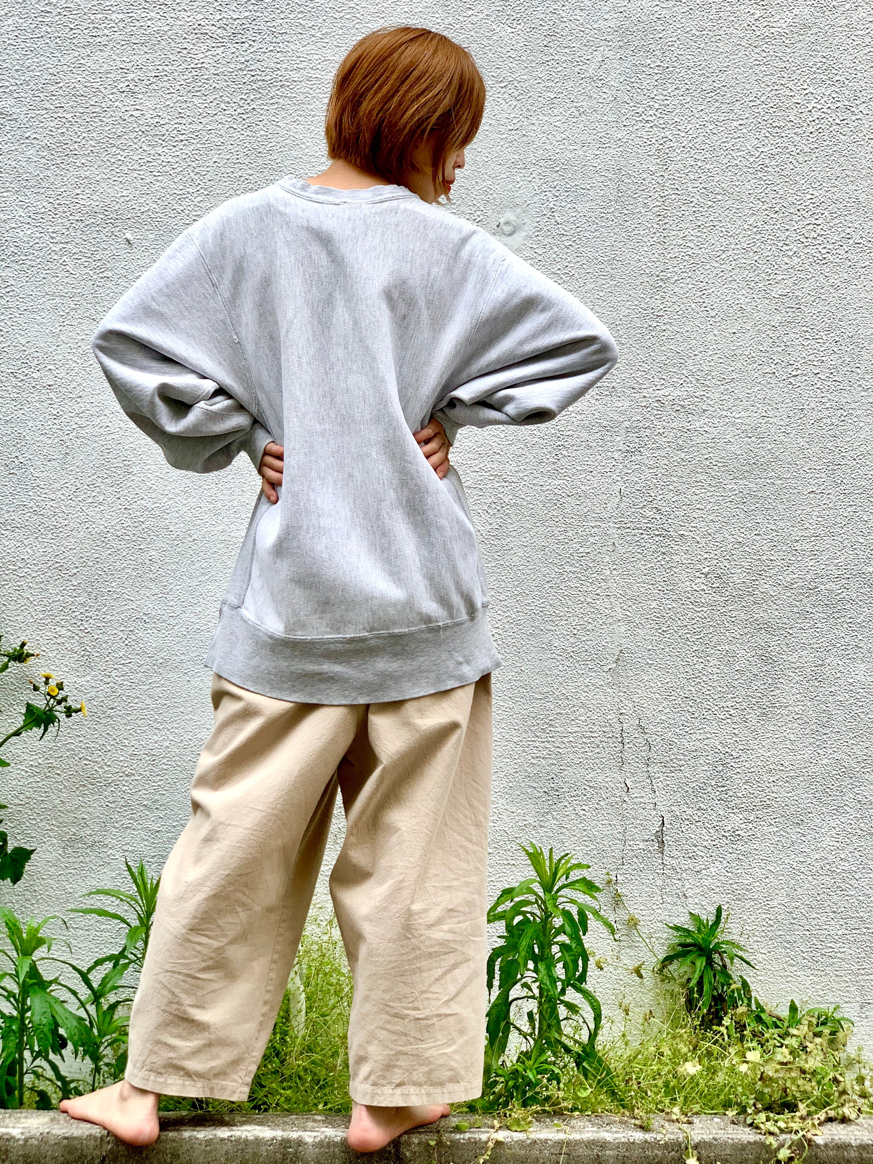 スウェットが縦方向に縮むのを軽減するために、本来縦に使われている生地を横方向に使用。