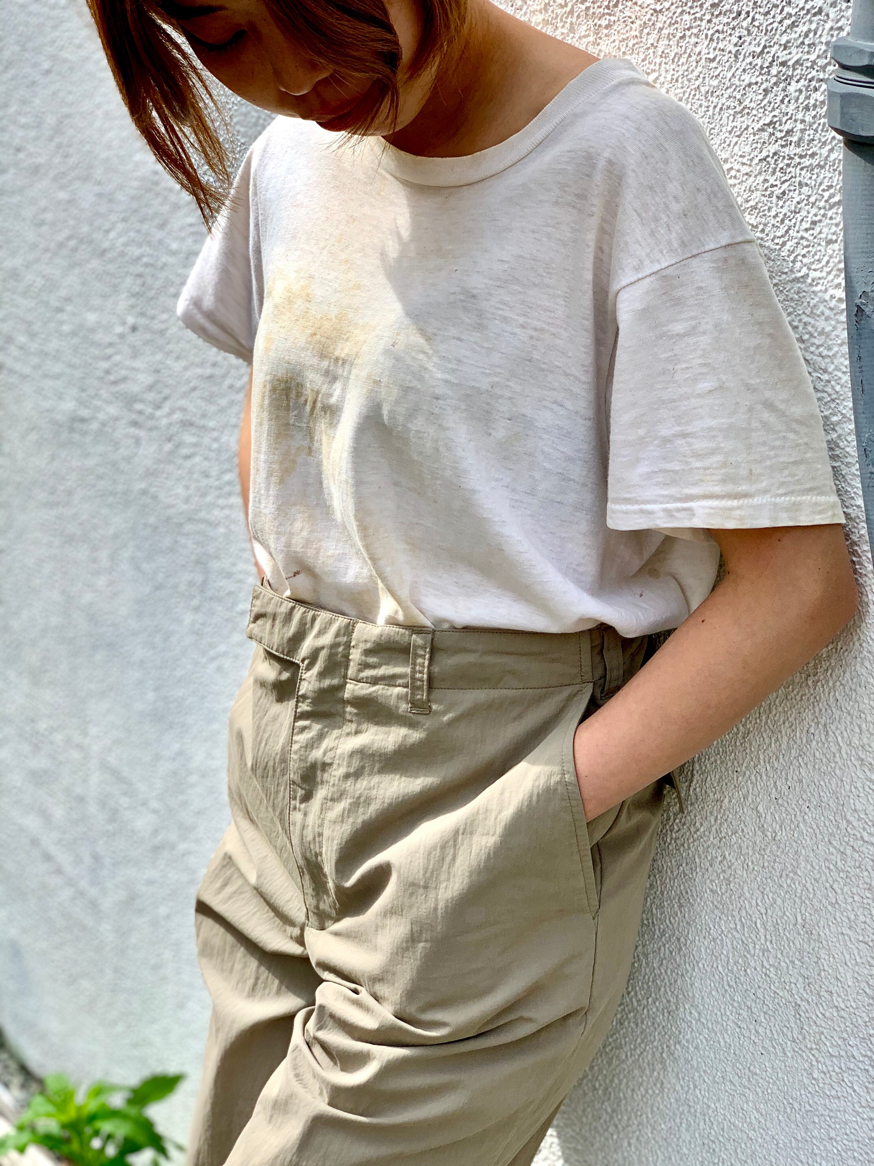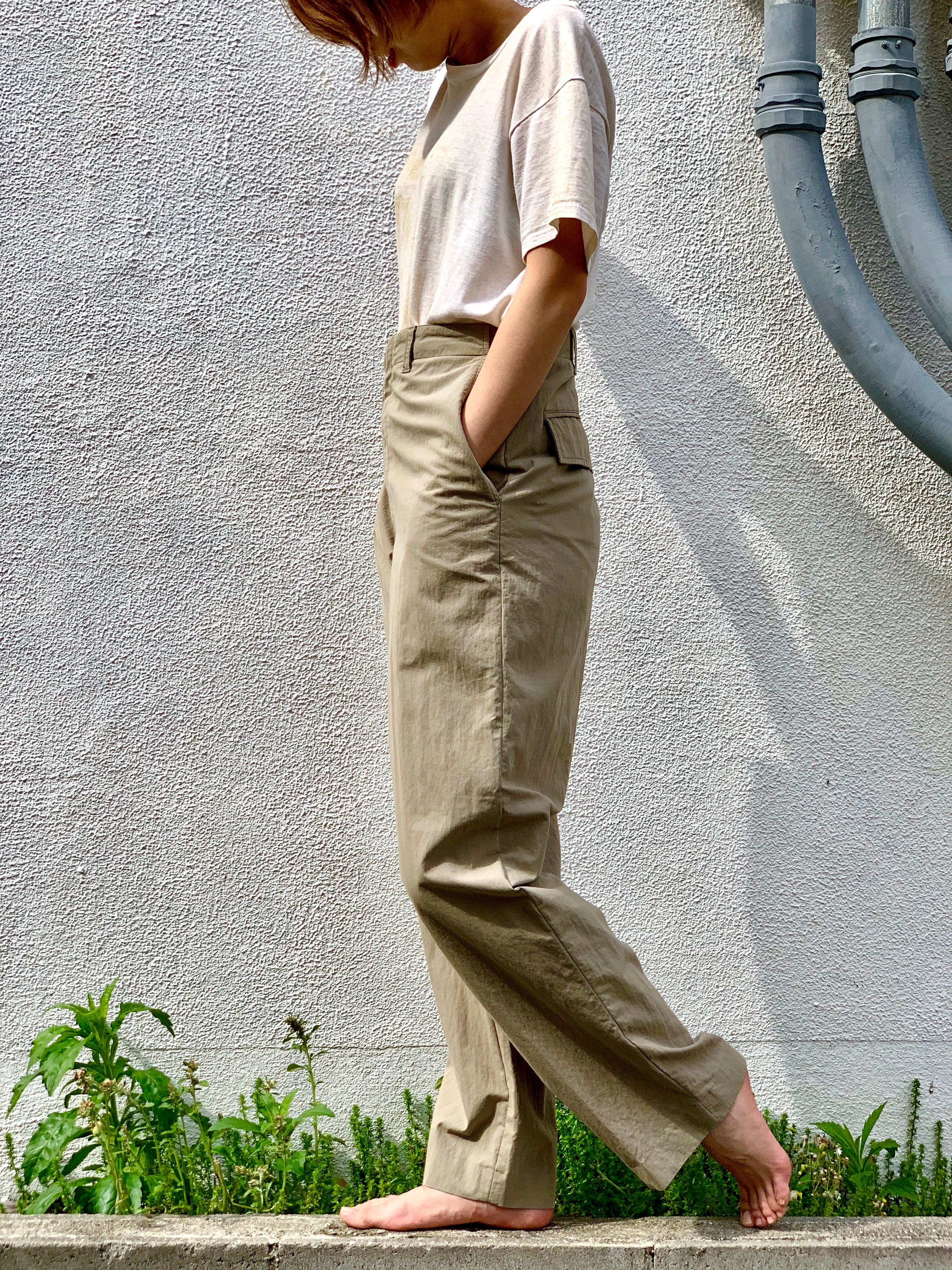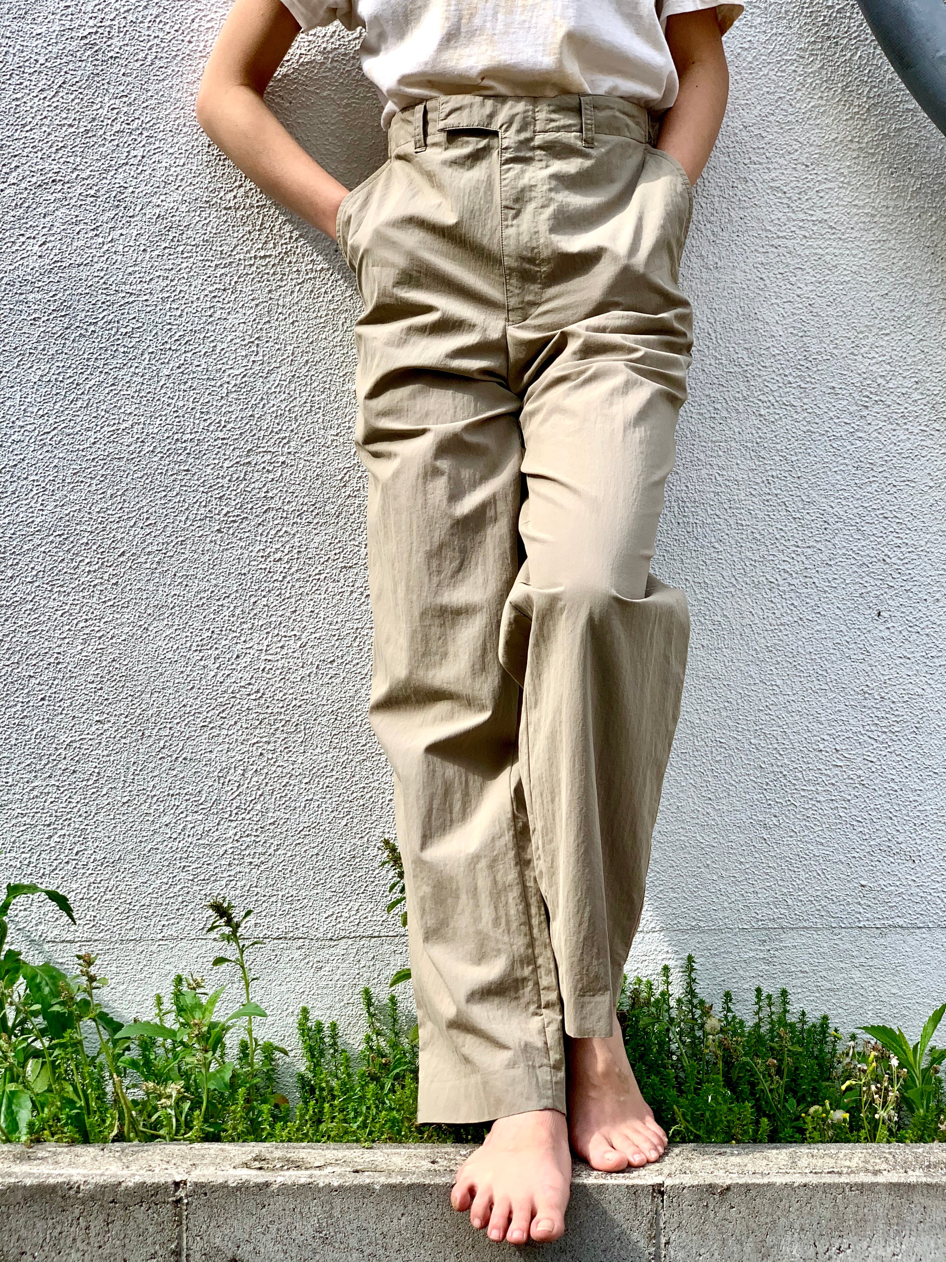 ベージュのパンツは、幅広く使えるアイテムかと。