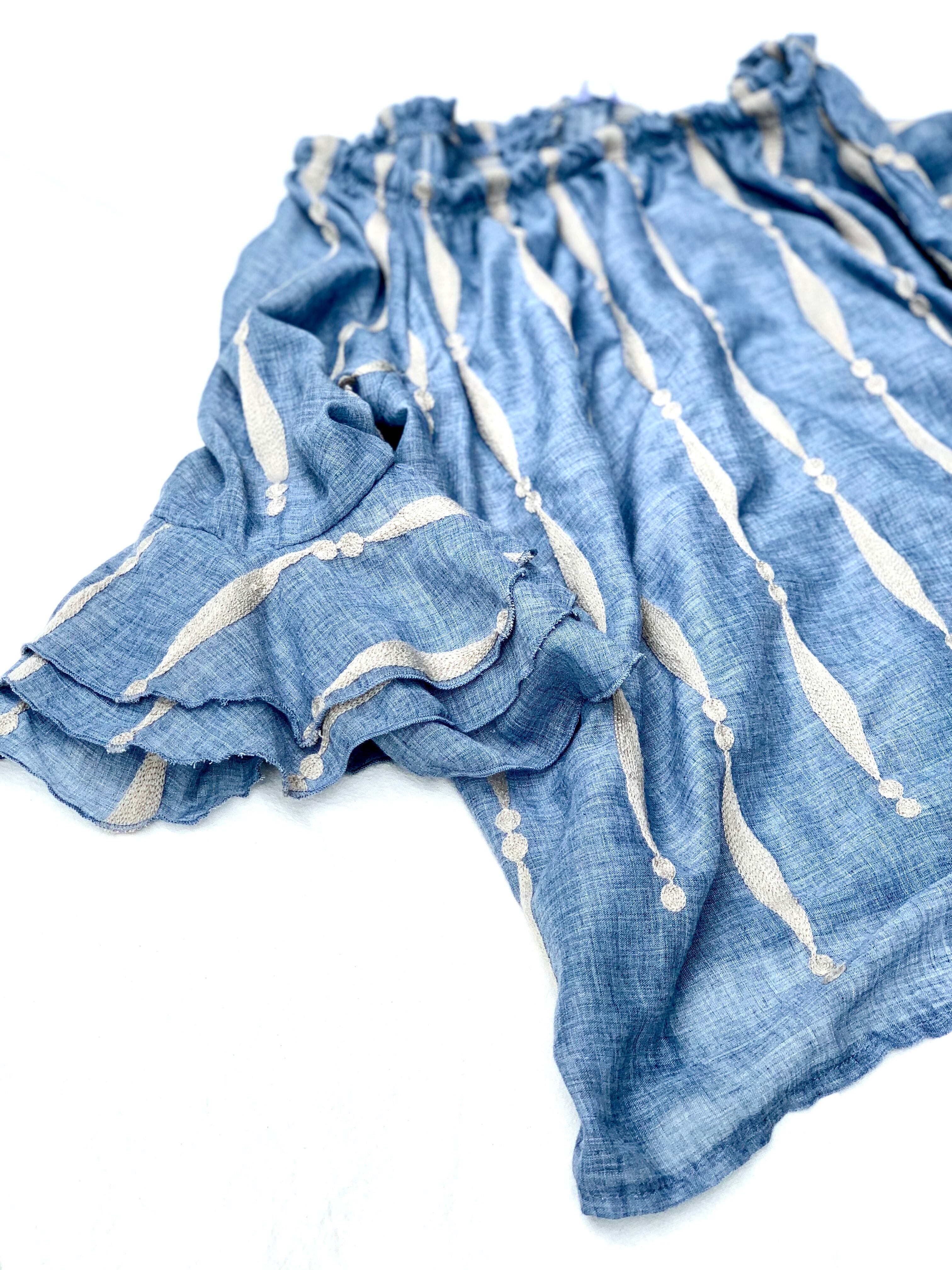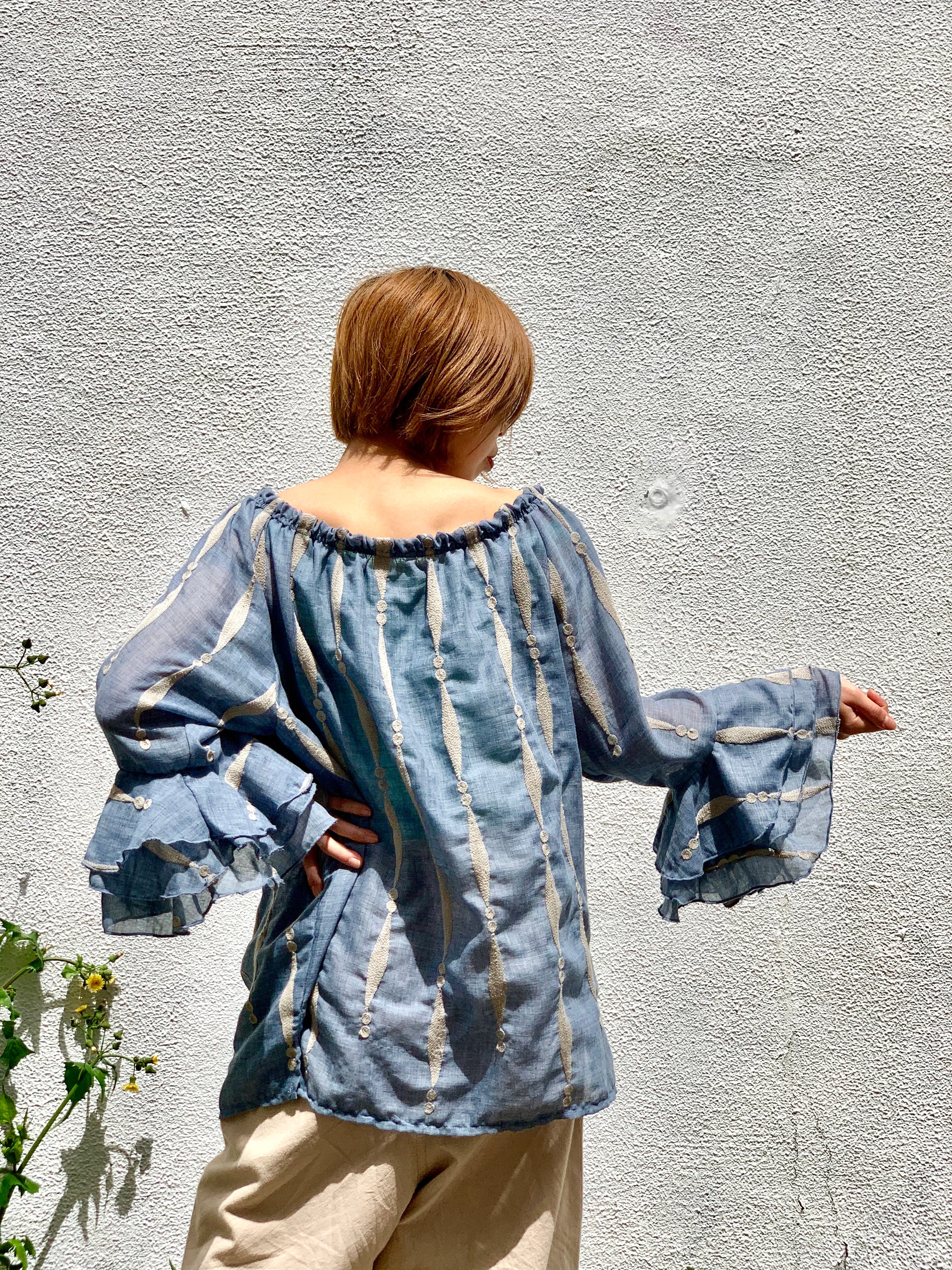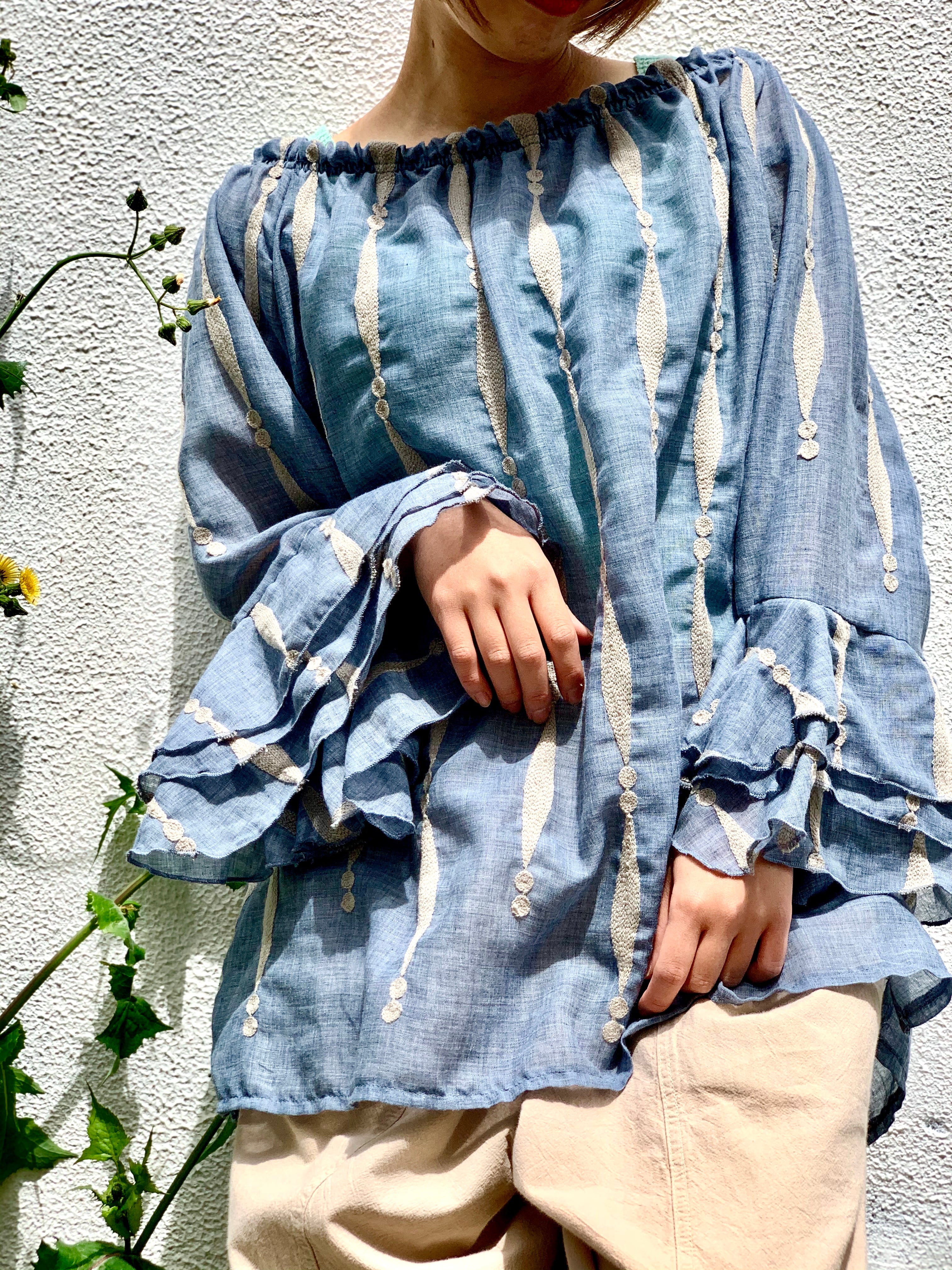 サックスブルーをベースにグレーのアクリル刺繍が映えるこちらのブラウス。