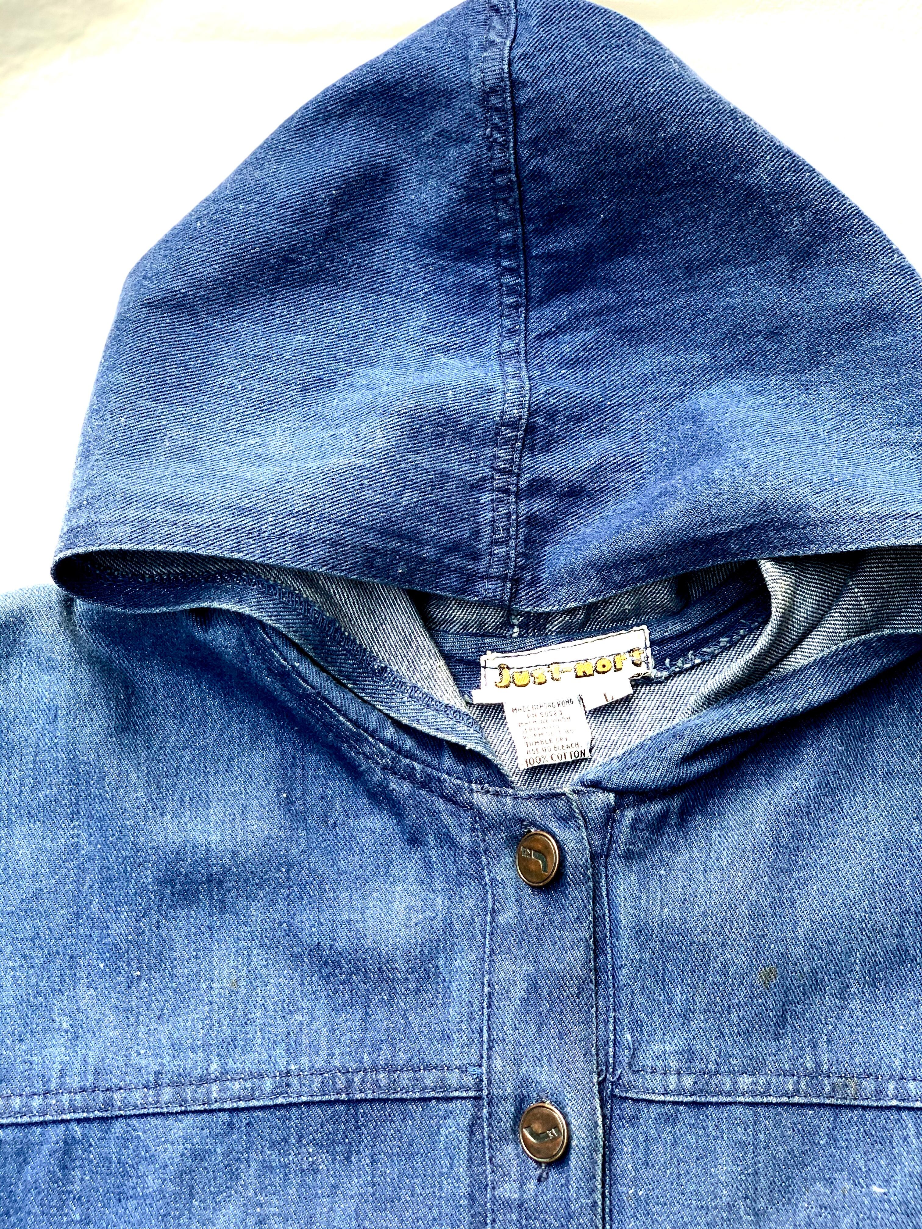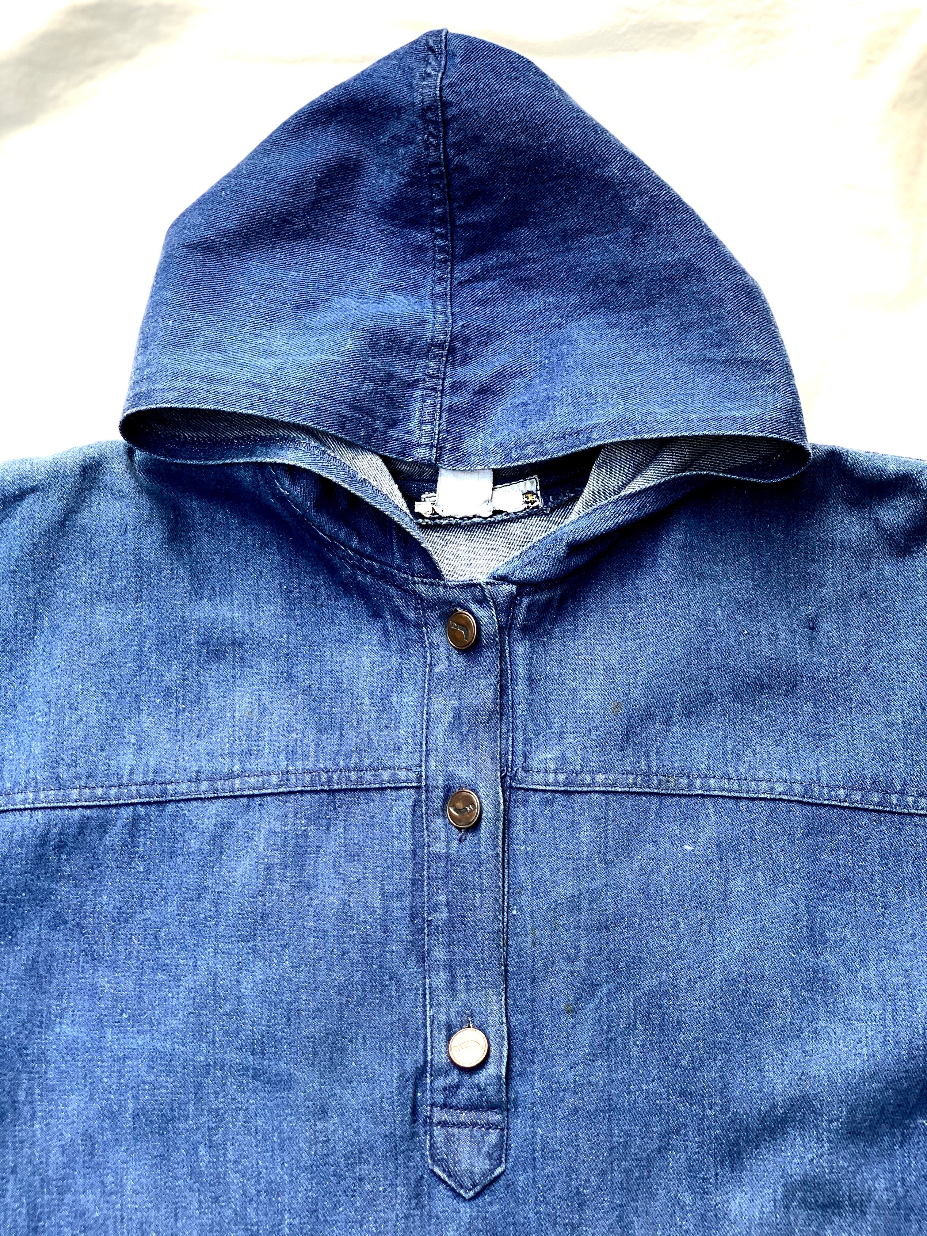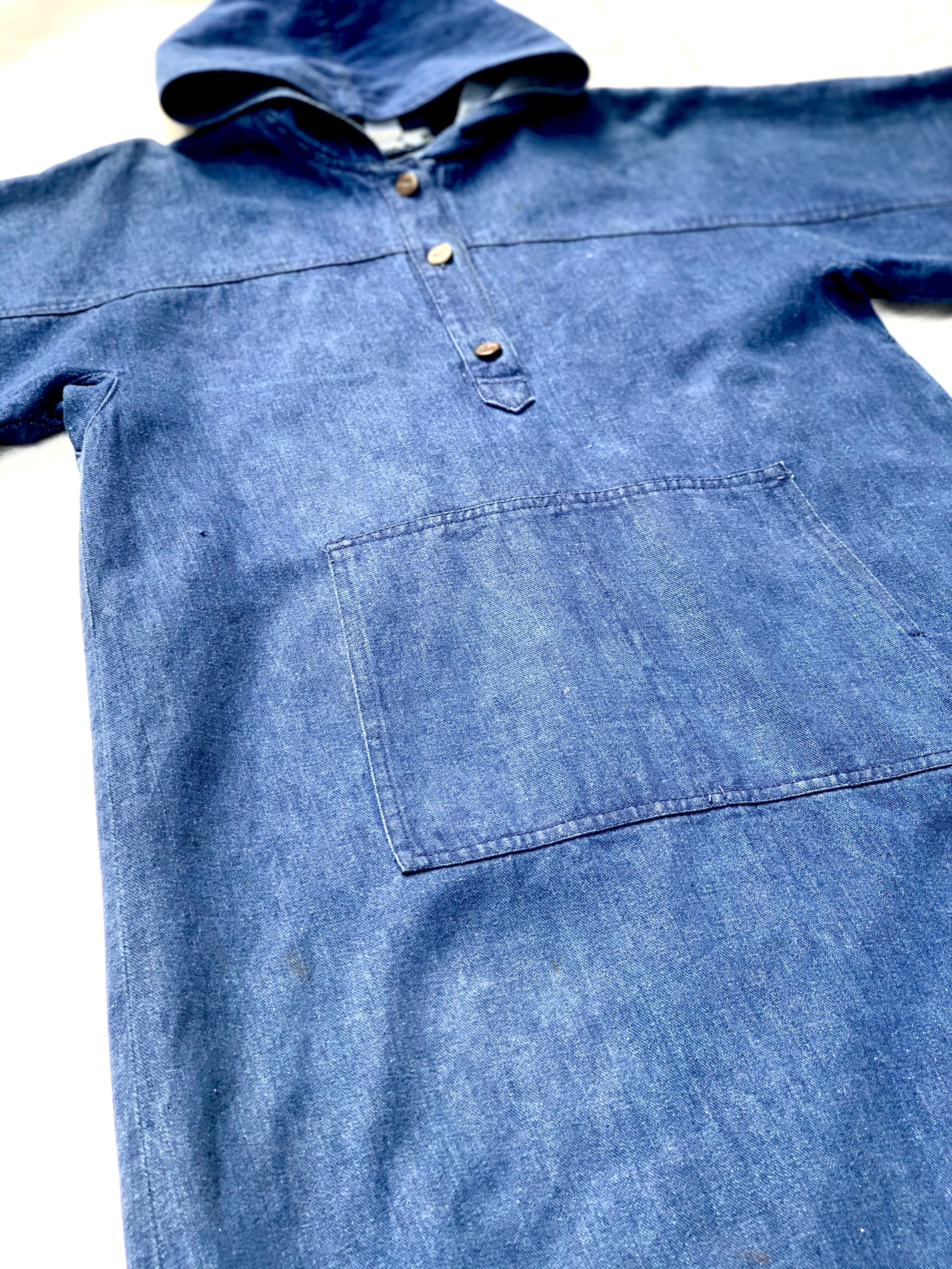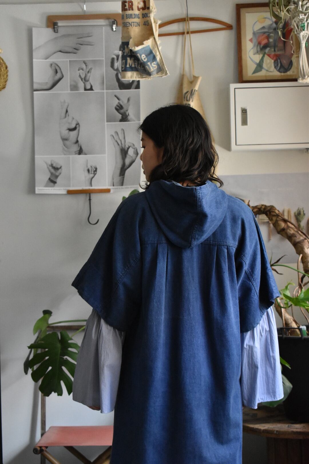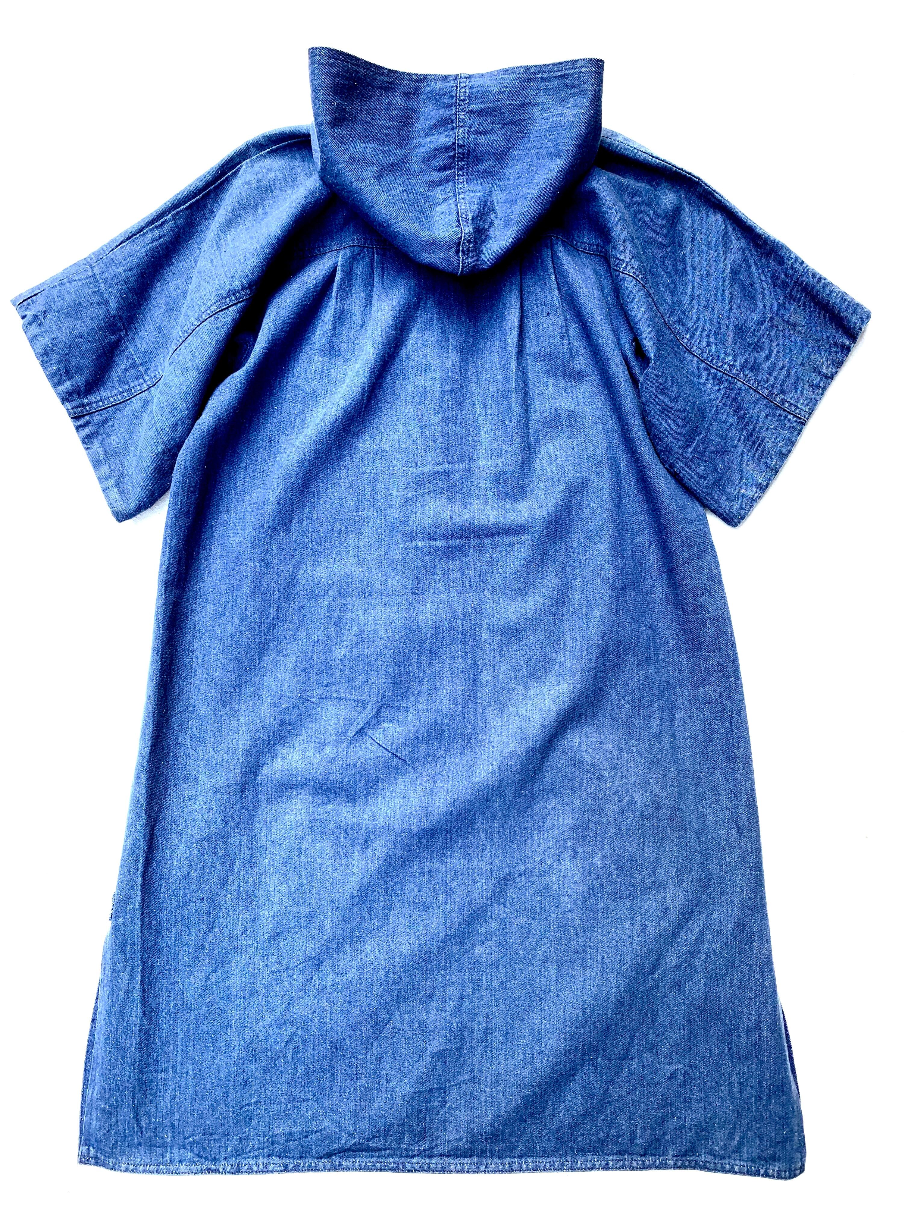 デニムで半袖でフードが付いててロング丈で真ん中にポケット。