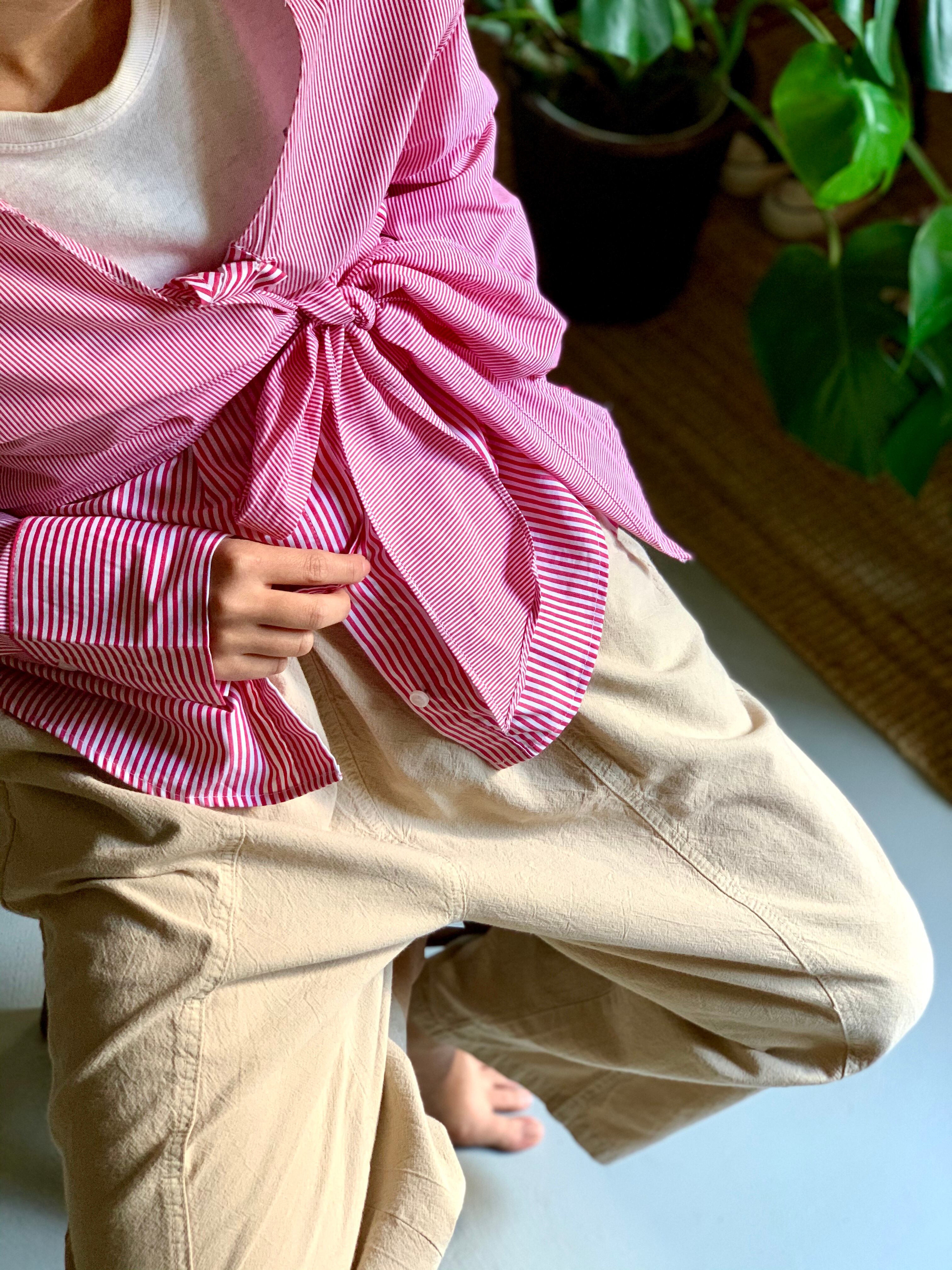 胸元部分で縛れるデザインになっており、緩く絞ったりきつく縛ったりする事でシルエットに変化を出せます。