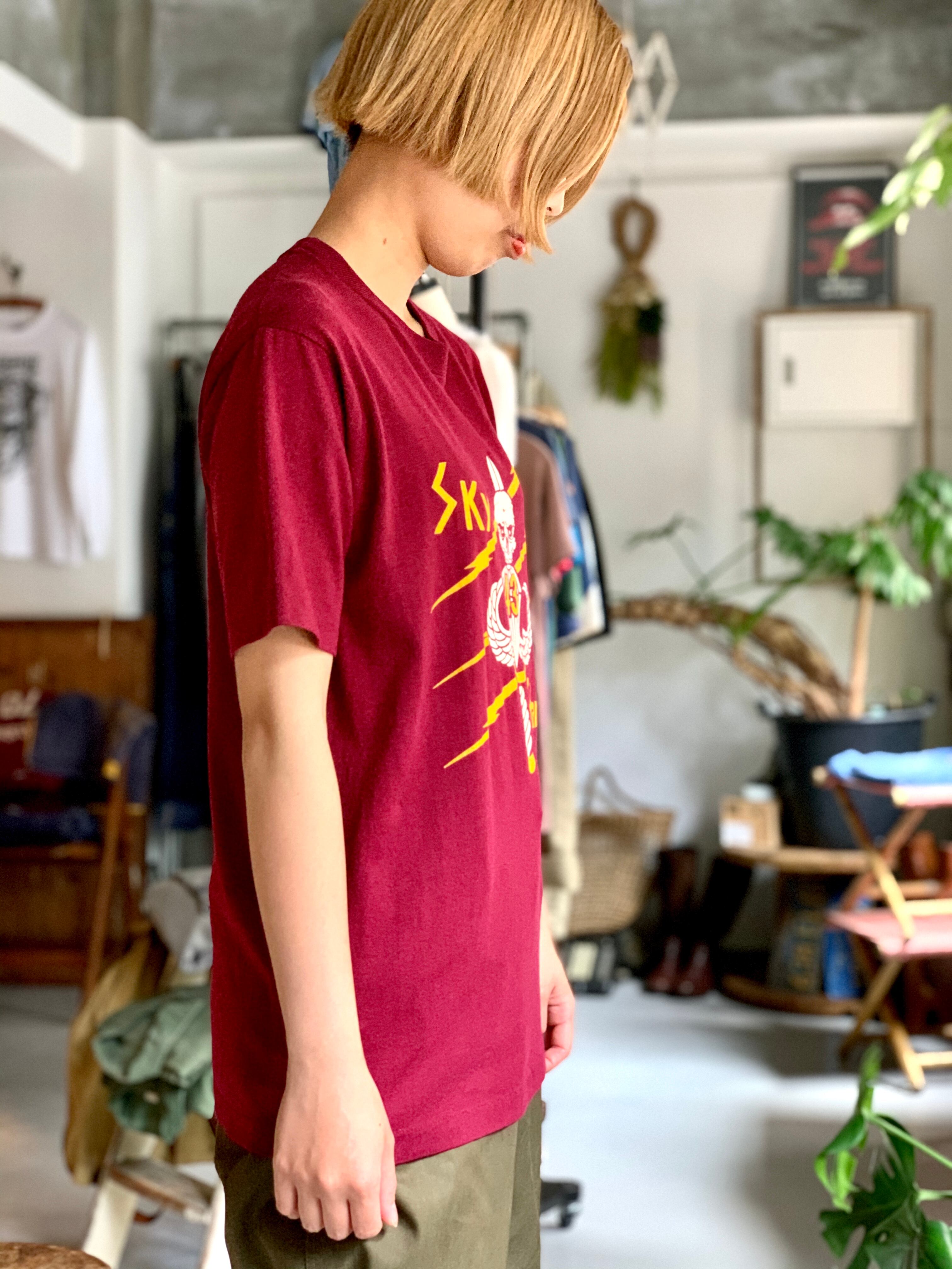 臙脂色のボディにラバープリントでスカルがプリントされているデザイン。