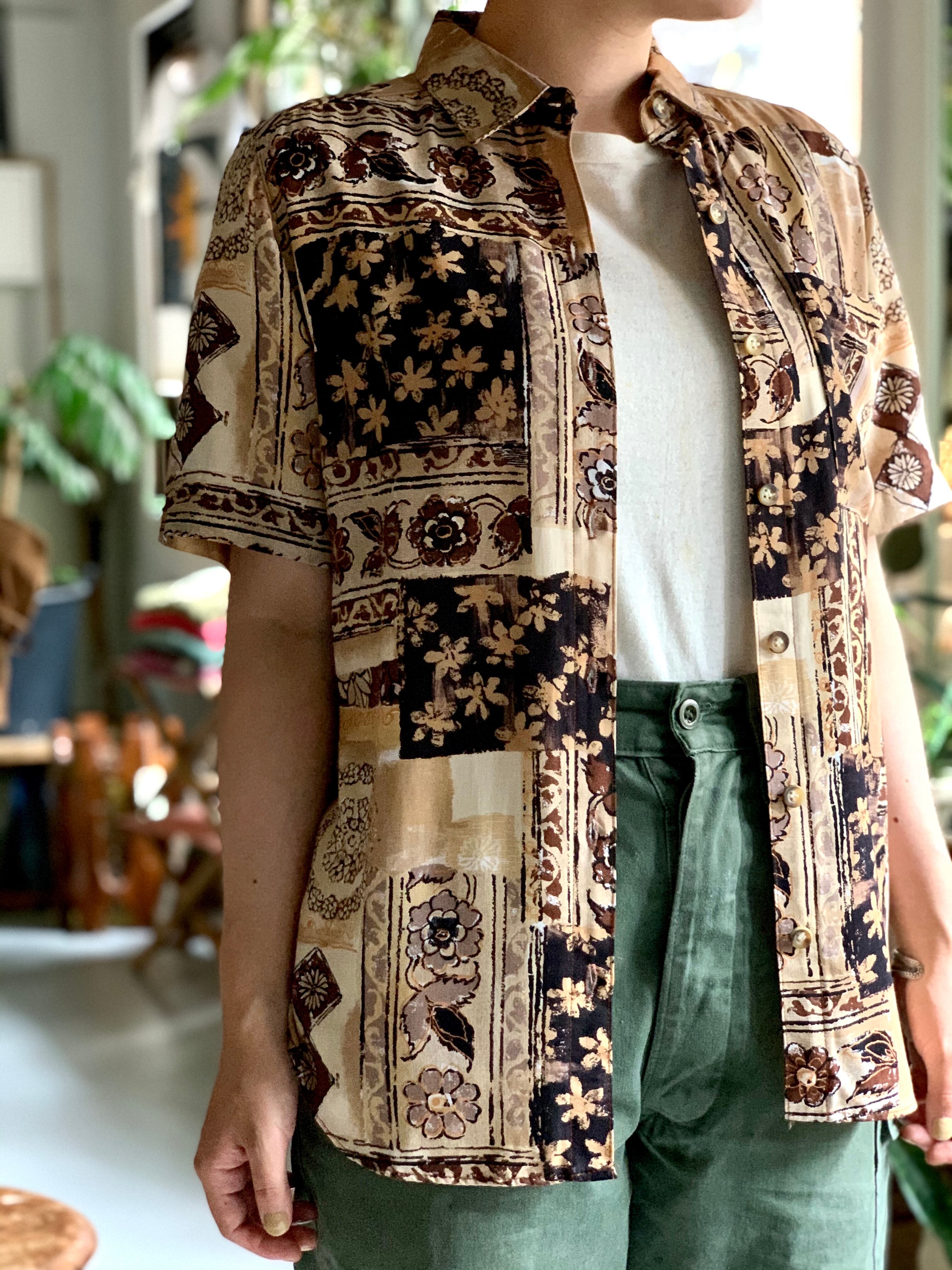 ボディーがブラウンベースで花柄の総柄、落ち着きがあるハワイアンシャツなので上品な印象。