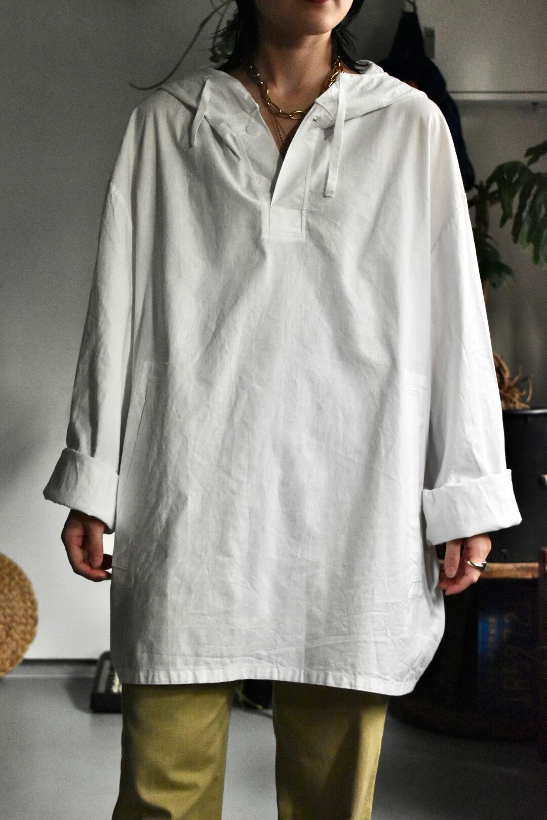 フロントはプルオーバーでレギュラー丈、ボタン仕様に変わっています。