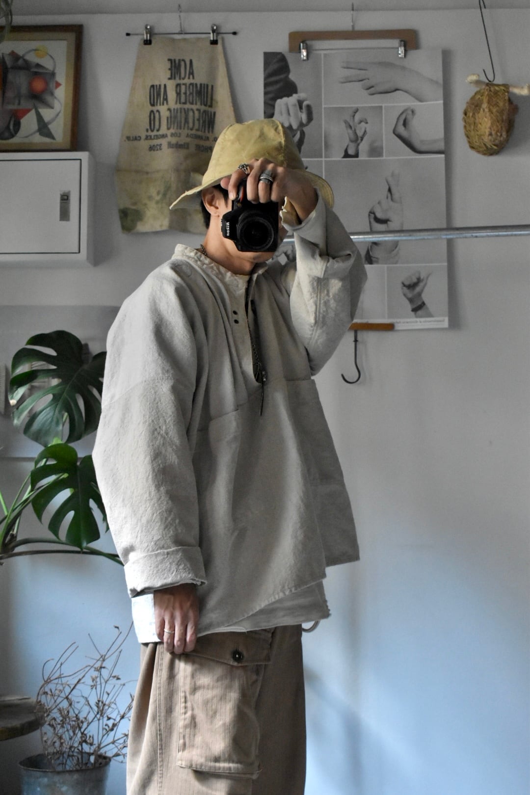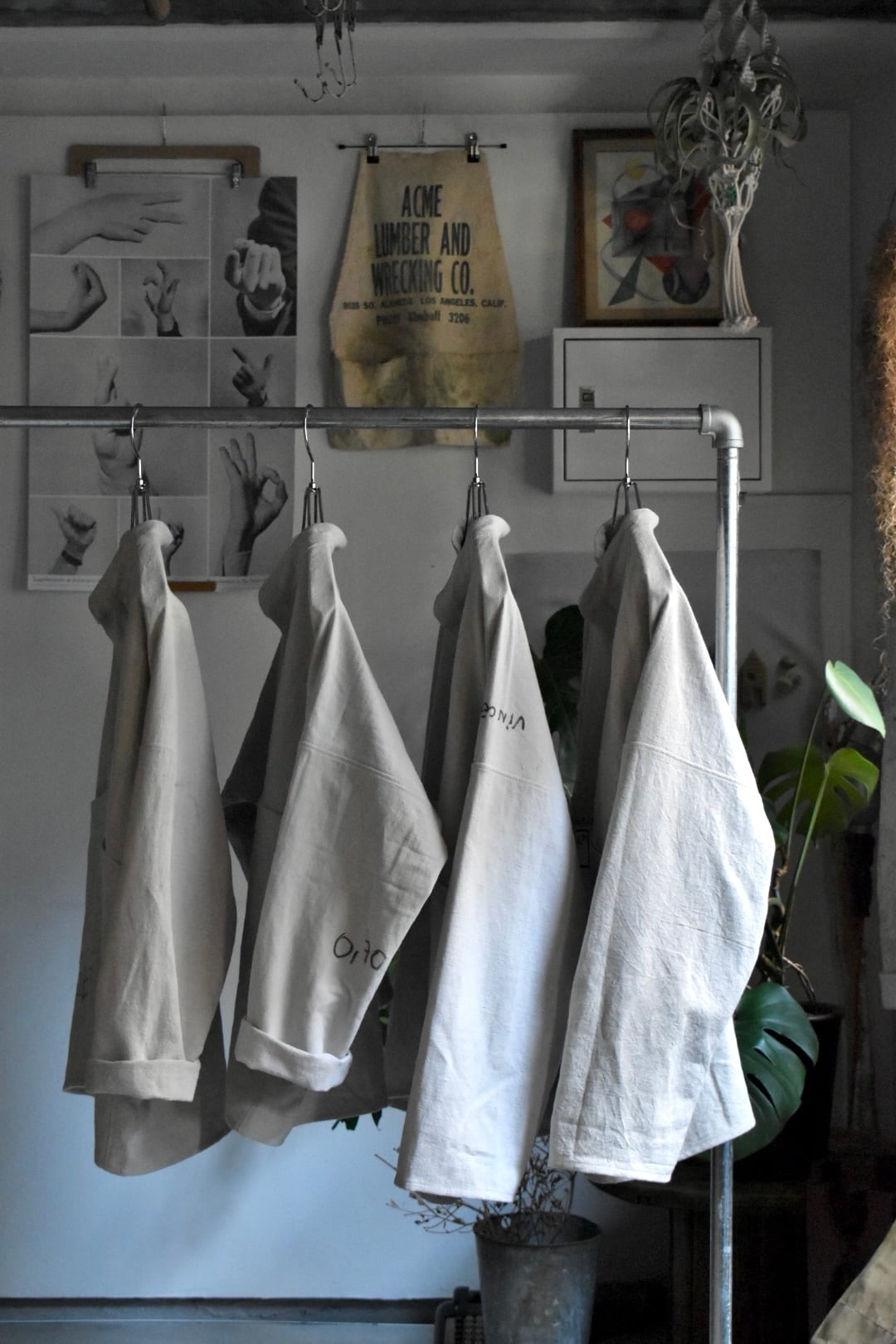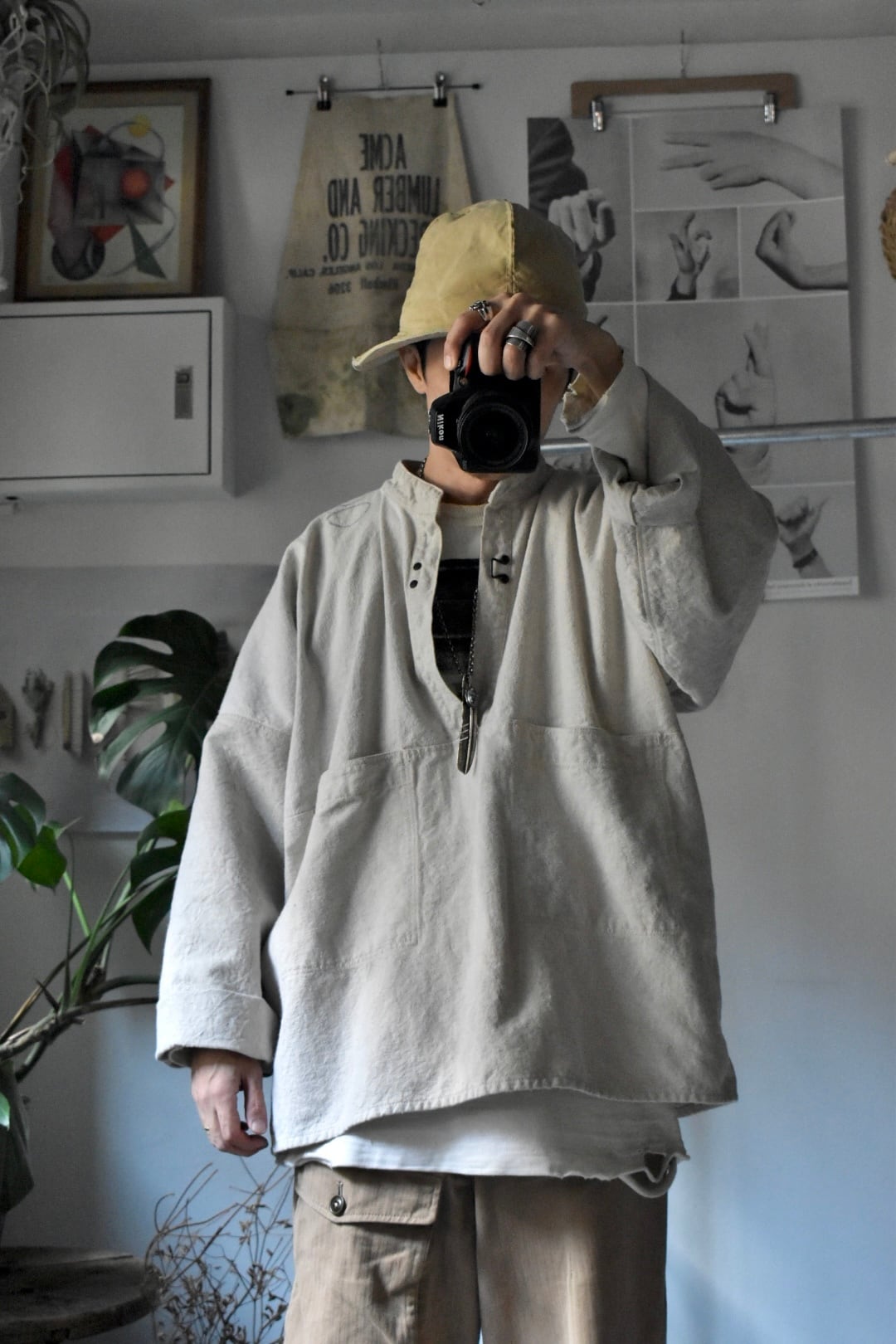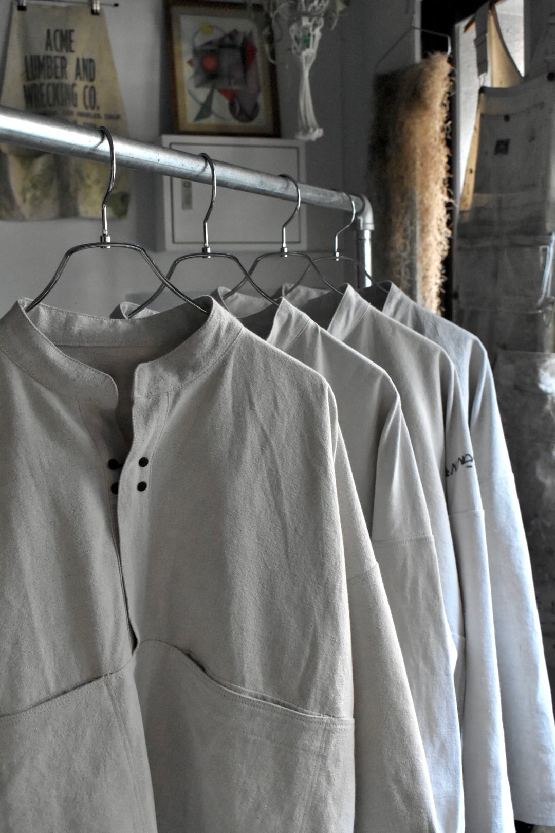 ガーデニングスモックにも似たシルエットで、フロントフックが特徴的。