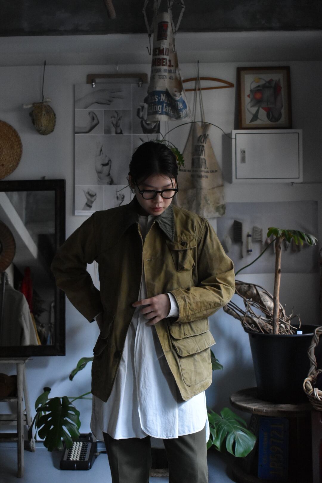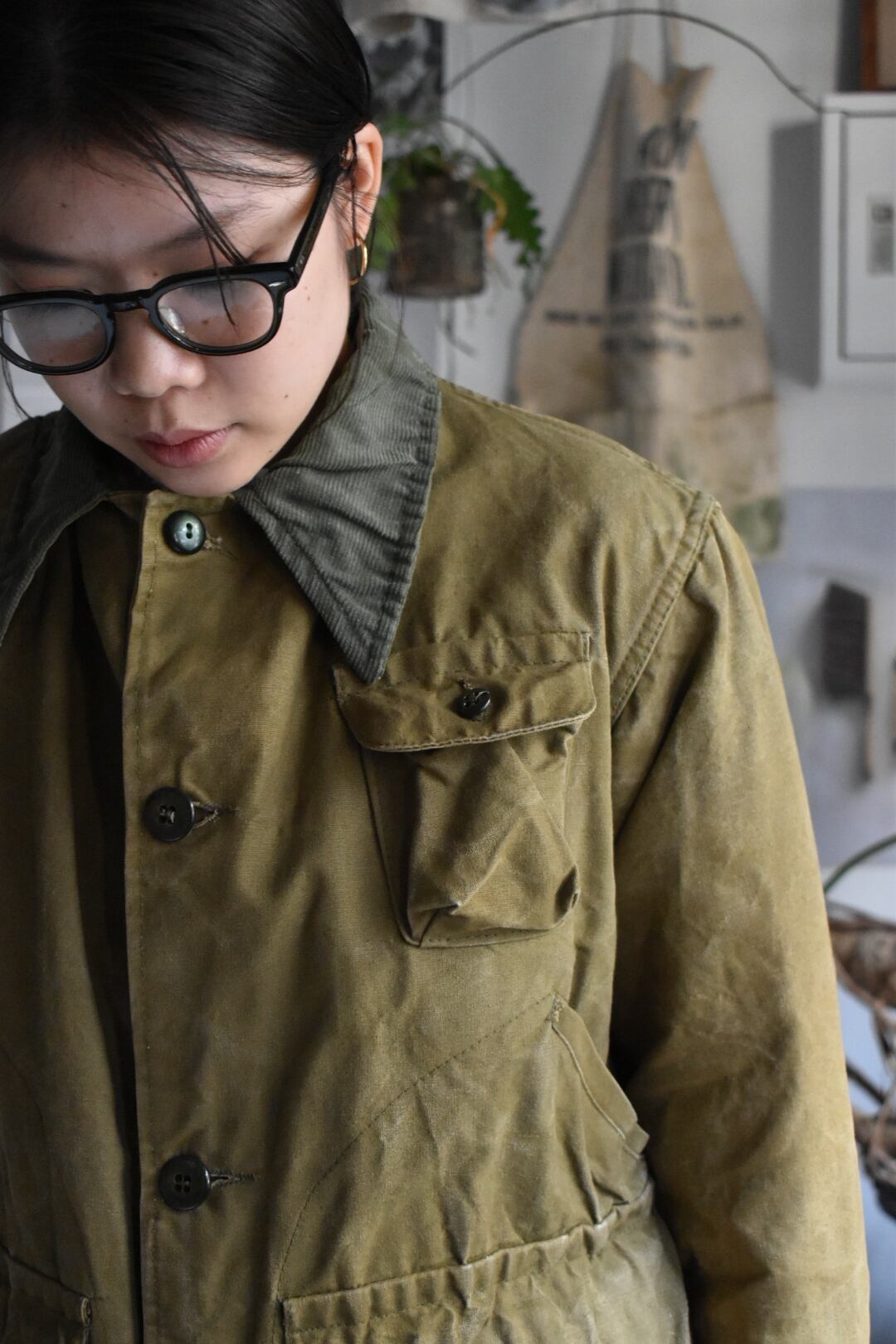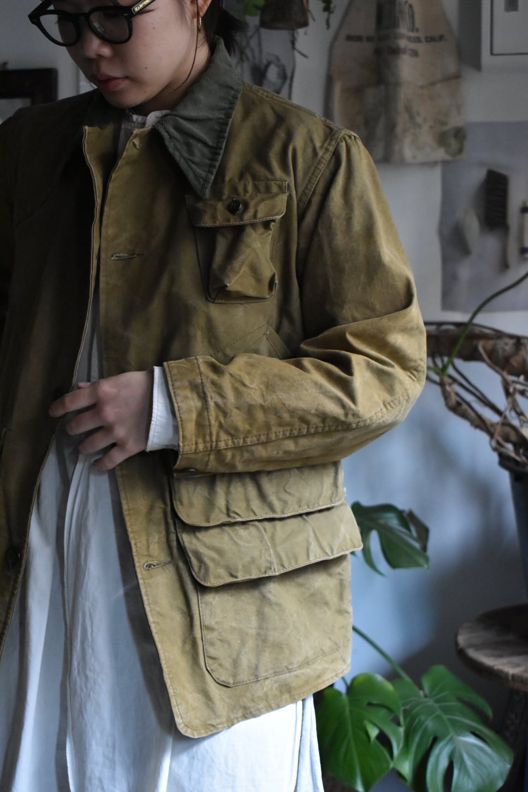 全体的に雰囲気抜群な色褪せも見られ、ブラウンカラーが主流のハンティングジャケット中では珍しいオリーブに近い色味となります。