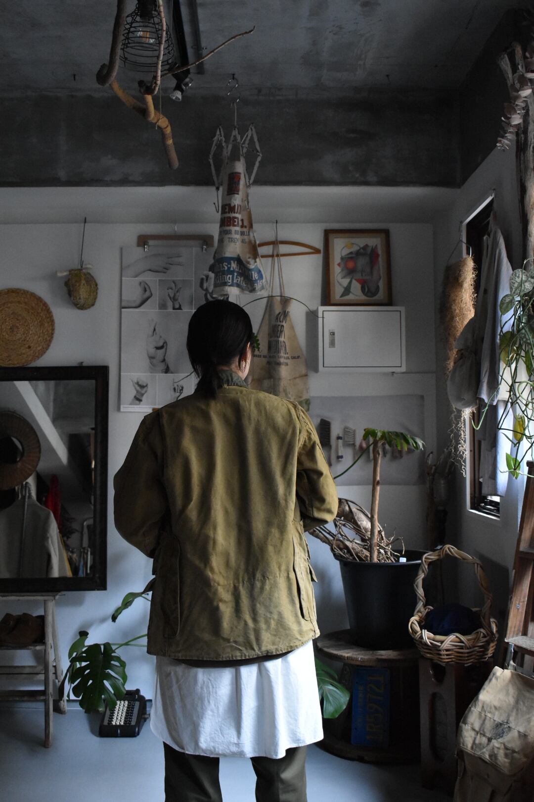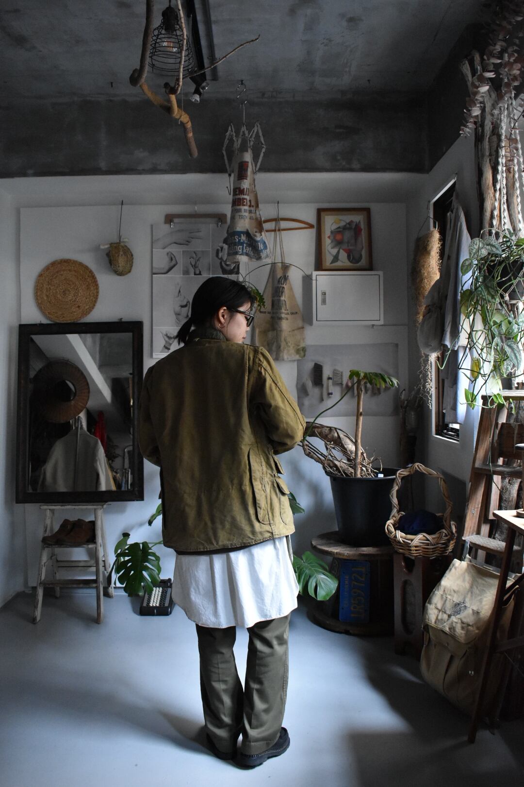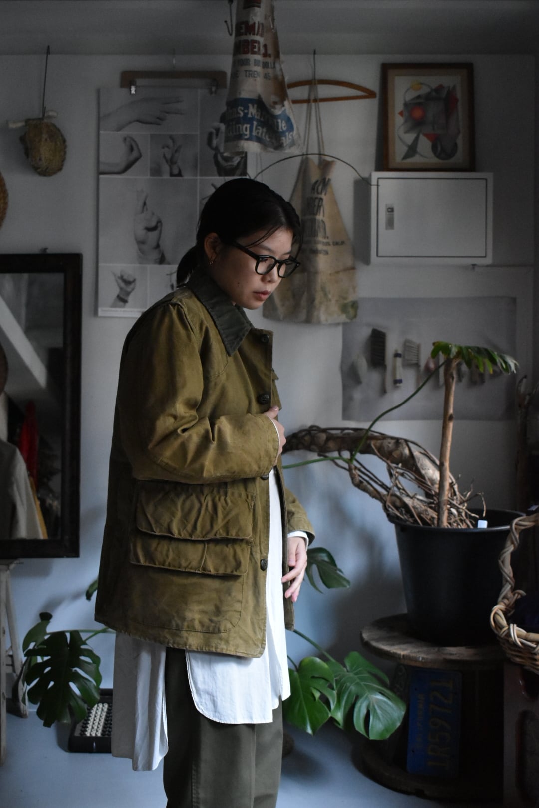 全体的に雰囲気抜群な色褪せも見られ、ブラウンカラーが主流のハンティングジャケット中では珍しいオリーブに近い色味となります。