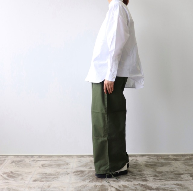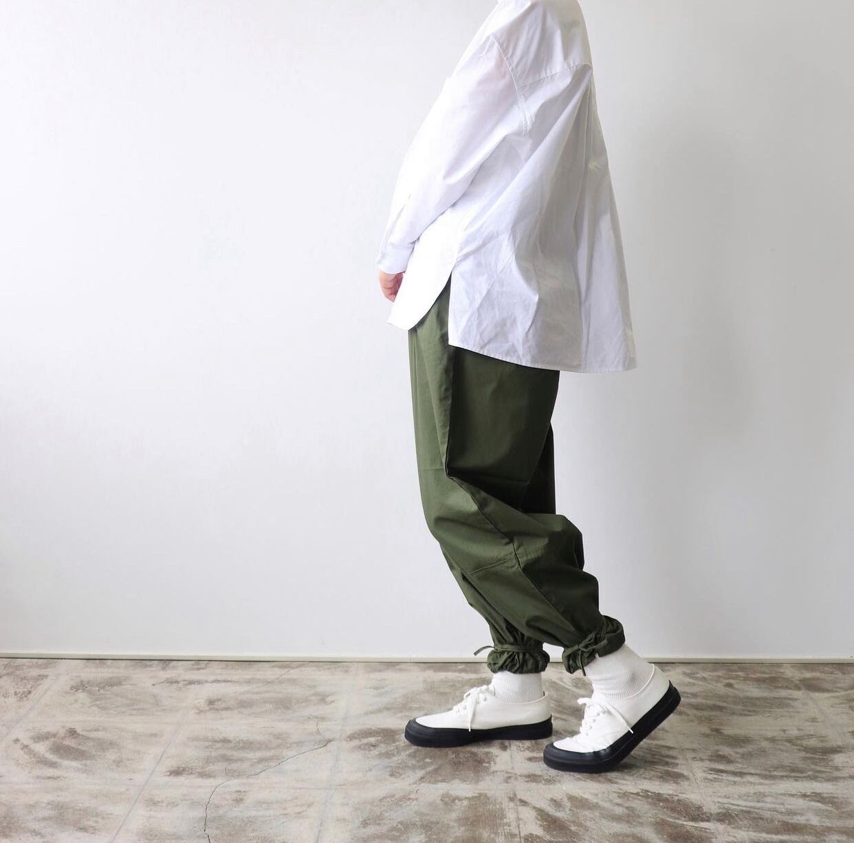 シルエットはワイドストレートシルエットですが、裾が紐で調節可能となっており、絞って蝶々結びやくるぶしに巻き付けてのスタイリングも可能です。