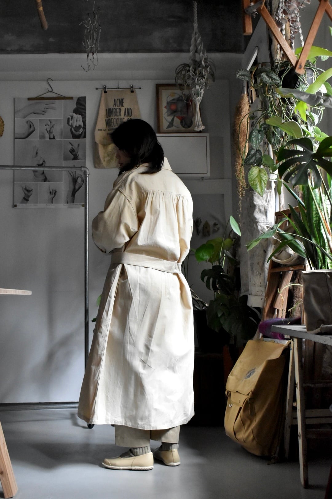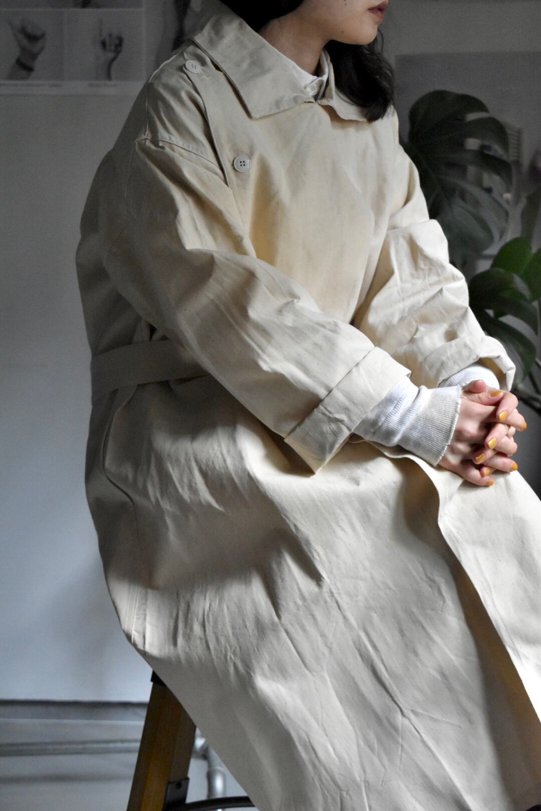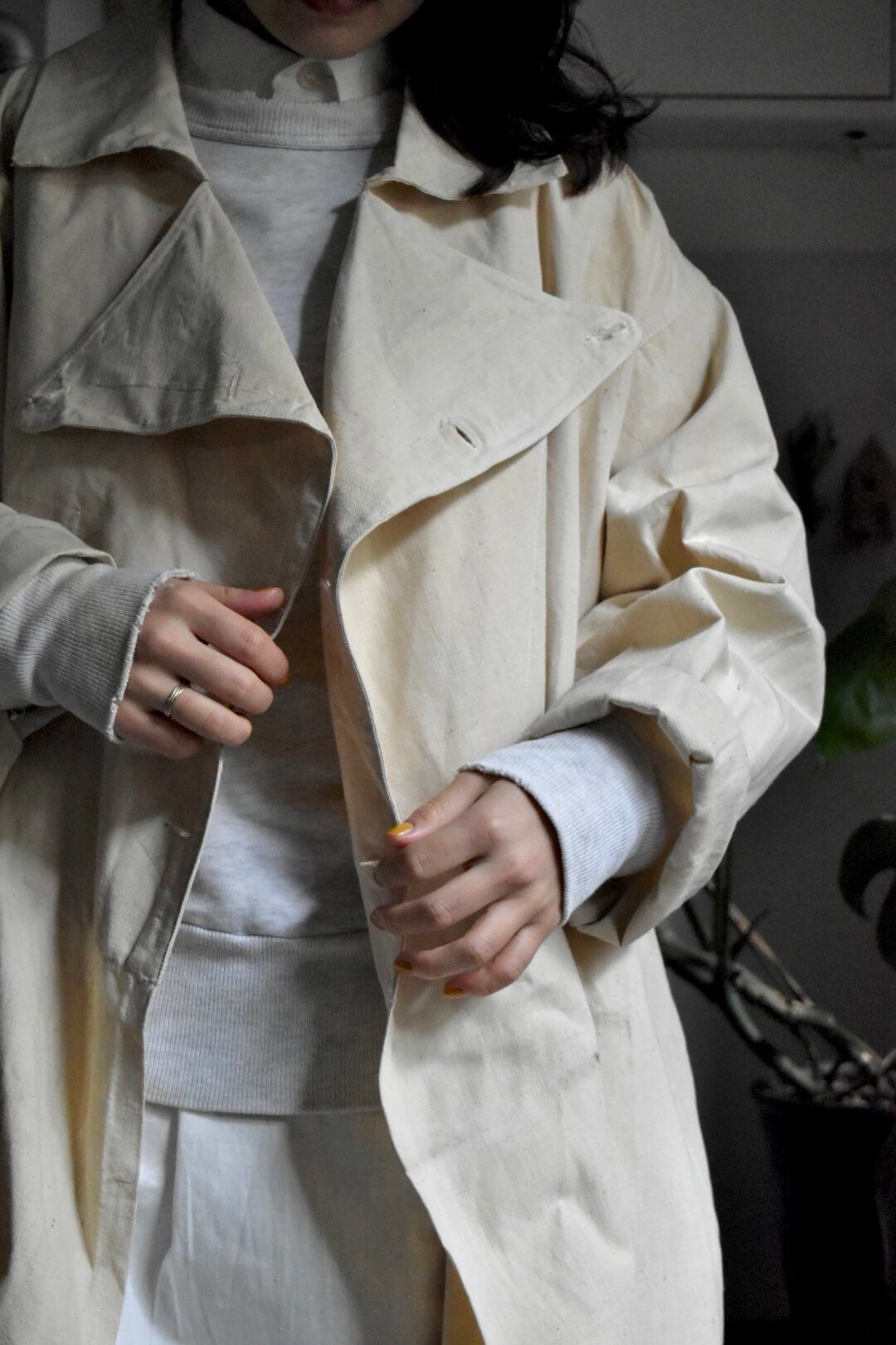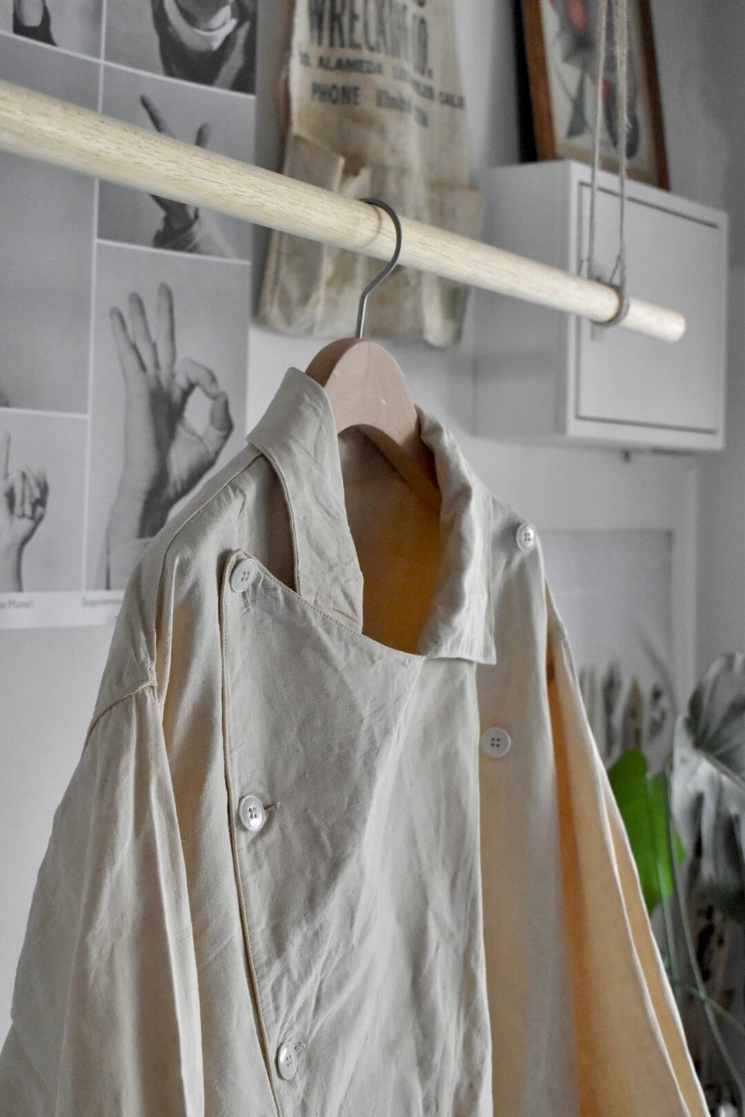 古い上質なフレンチリネン生地、良い雰囲気プンプンな大人のコートです。