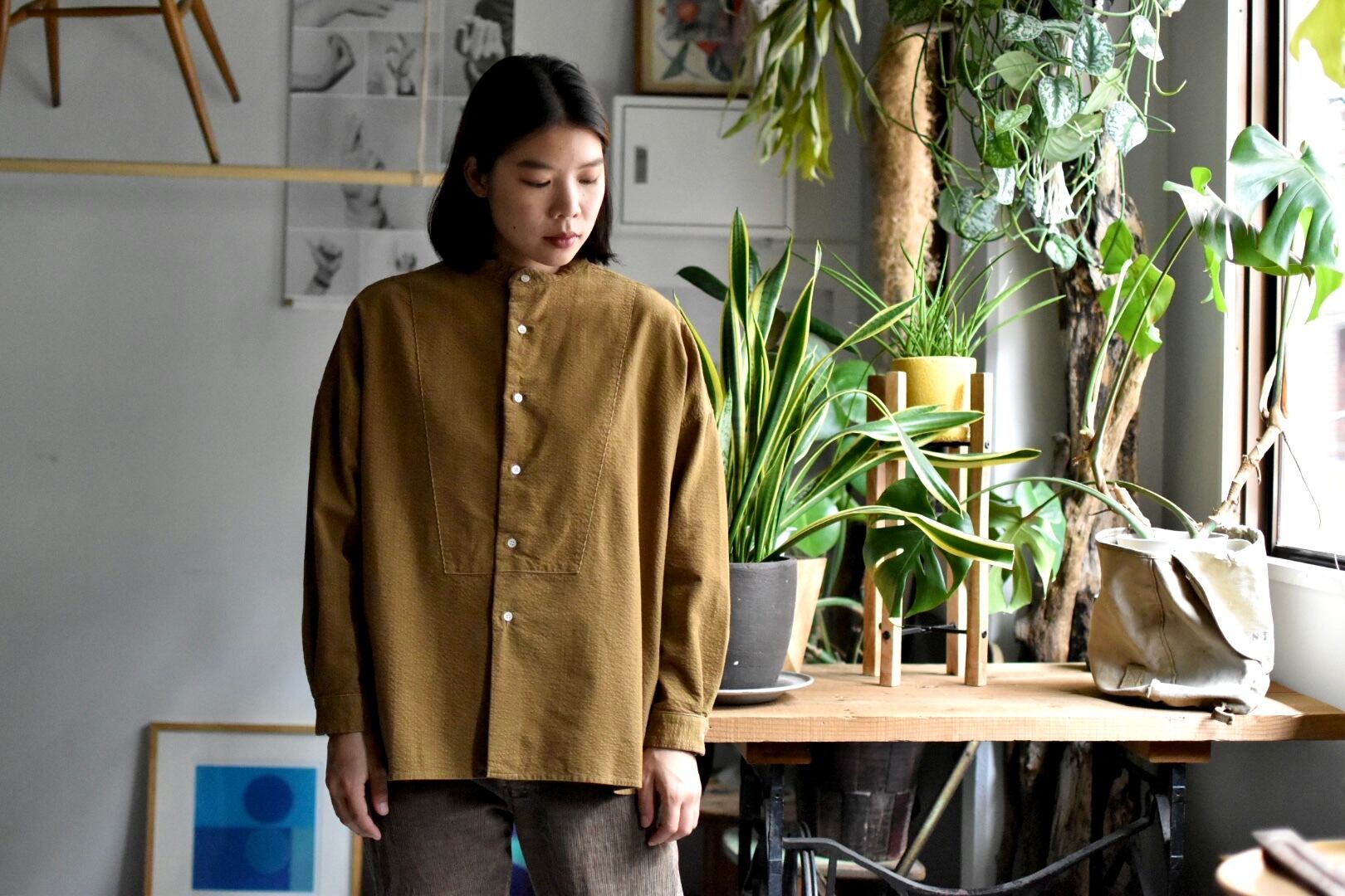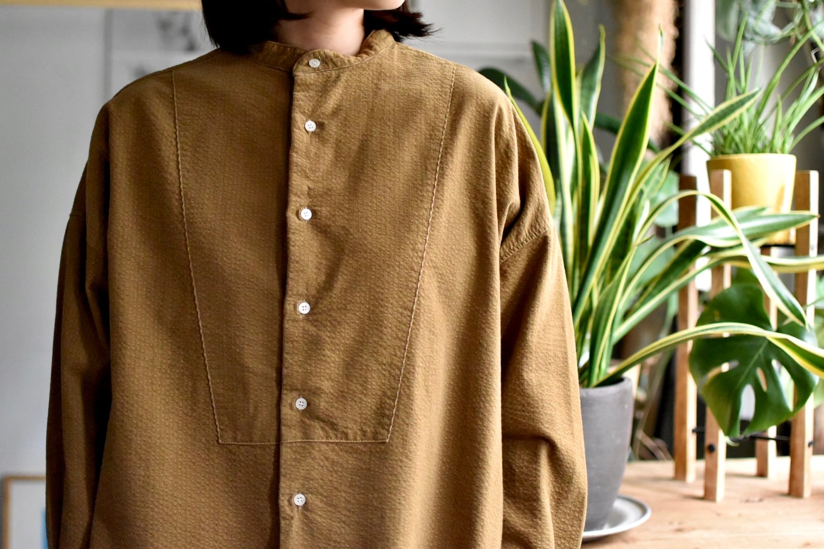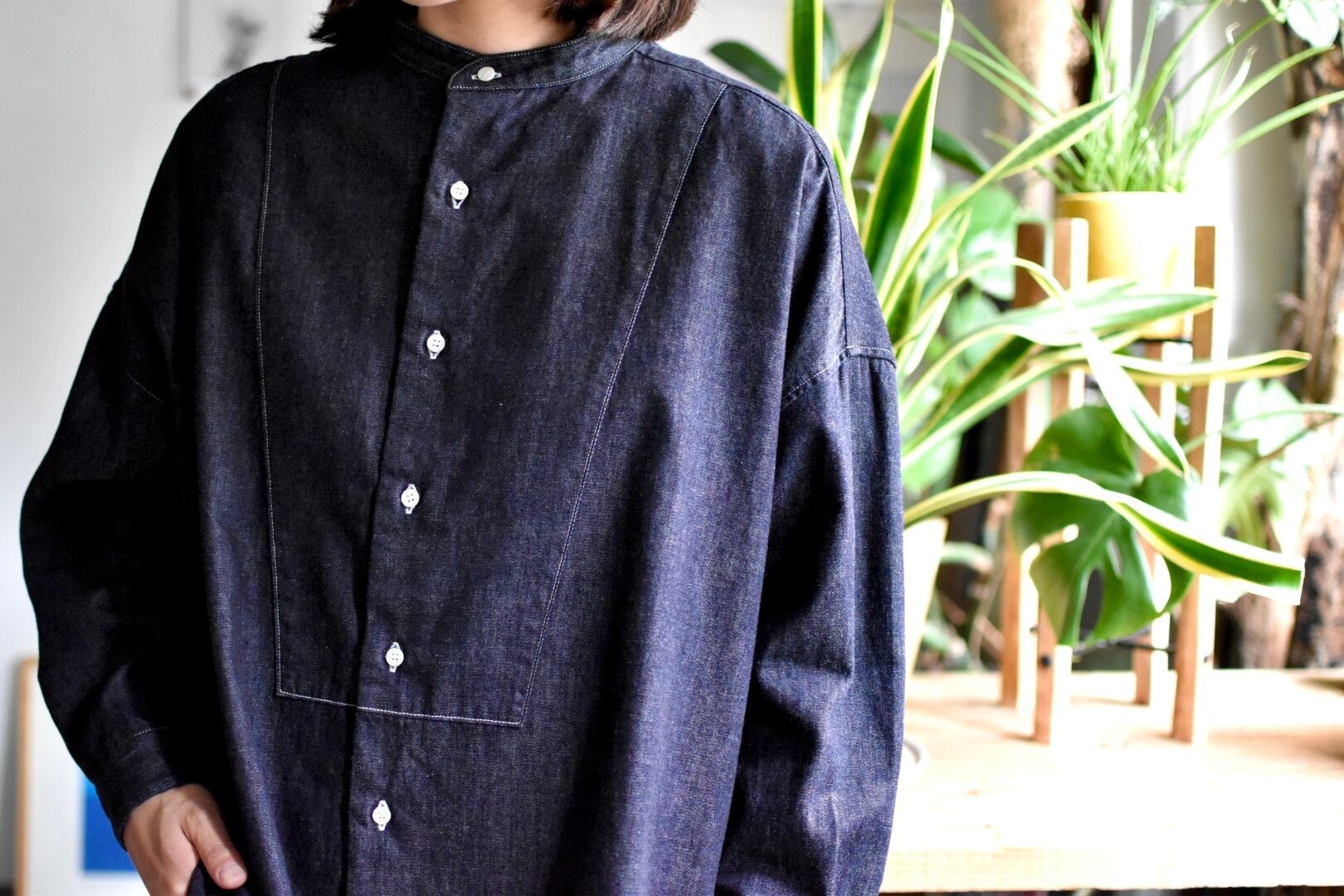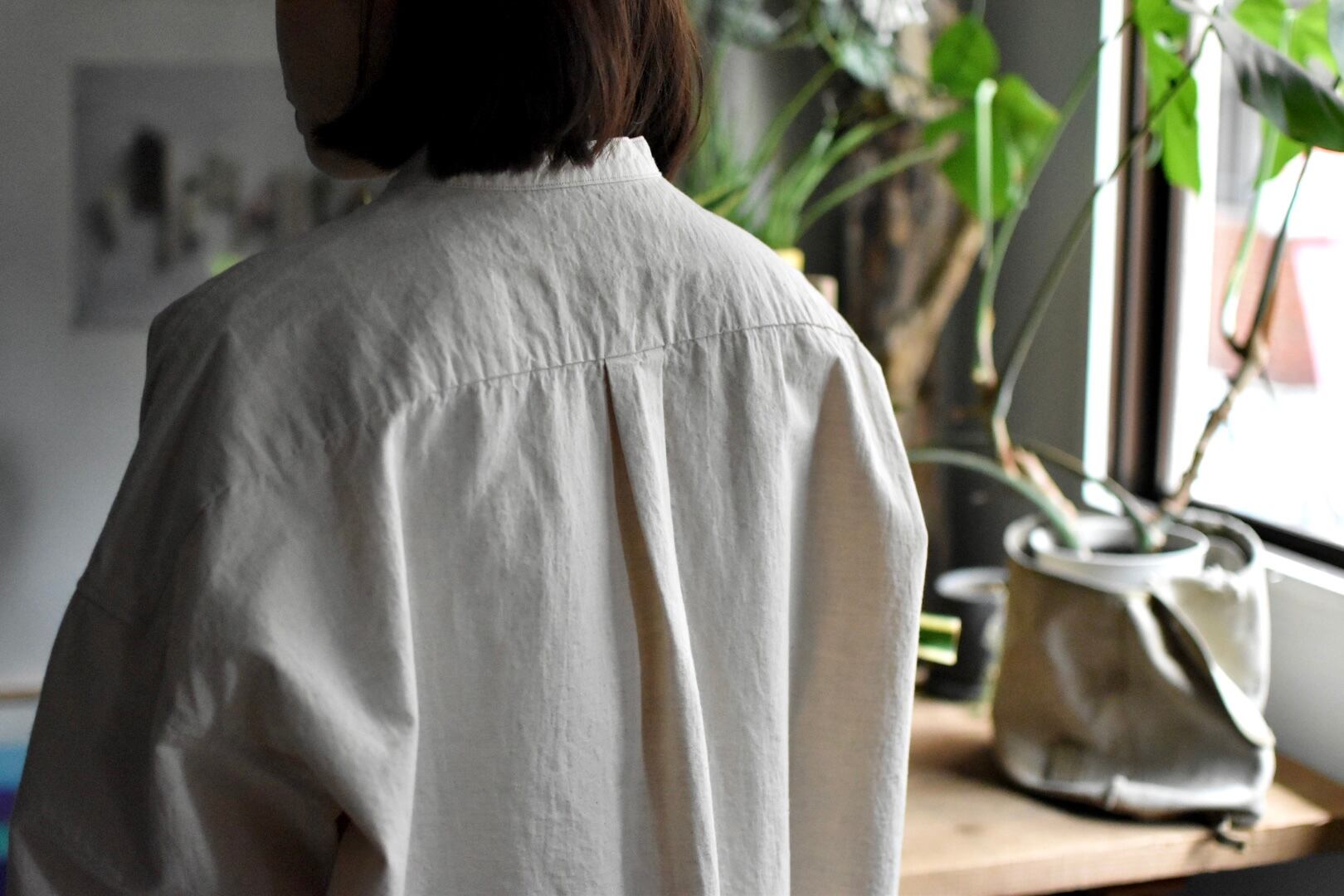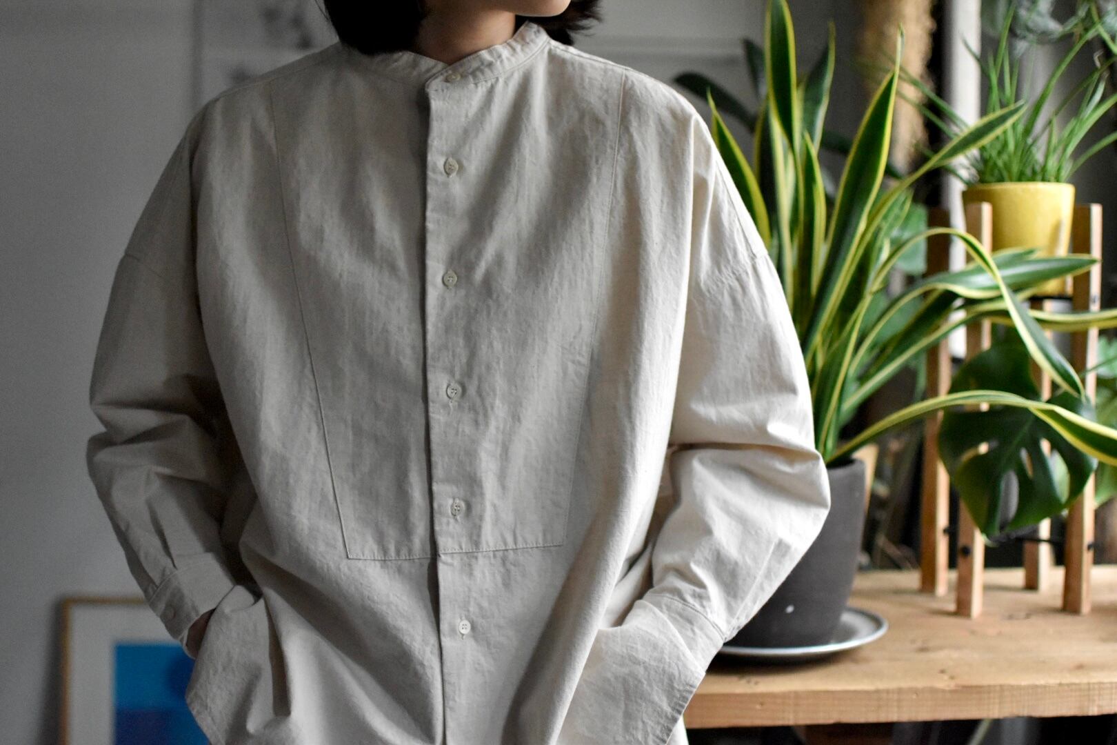 襟はバンドカラー仕上げでゆとりのあるボックスシルエット。