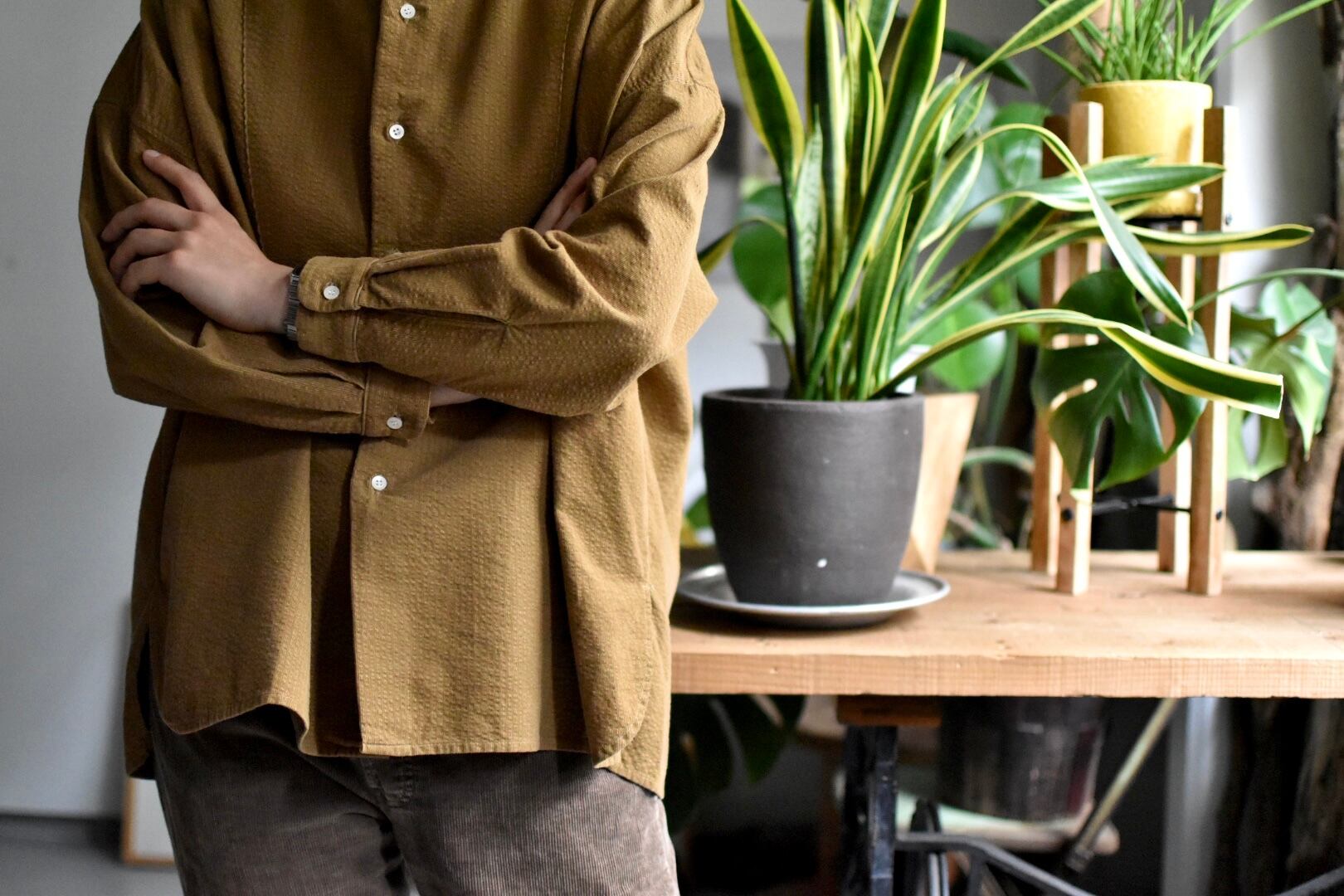 "sasanqua by trees" "band collor cherie shirt" "cotton hemp"(ivory) "soccer corduroy(beige) "60z katsuragi denim(navy) "AN-192"の御紹介となります。