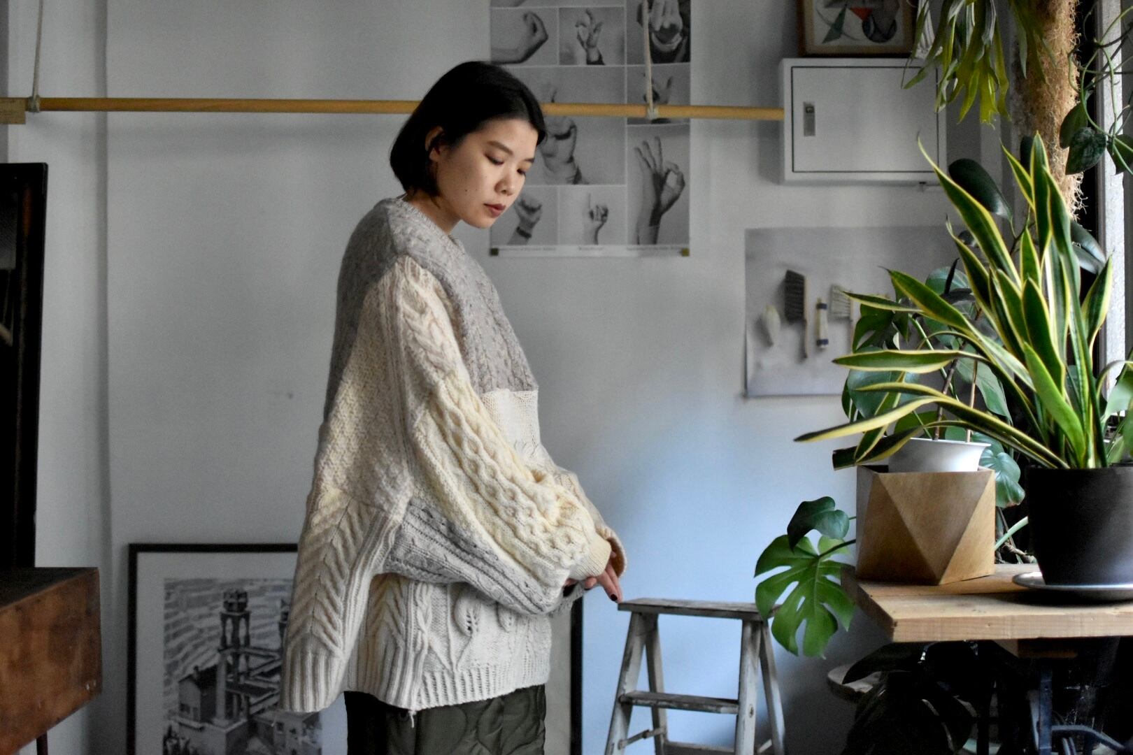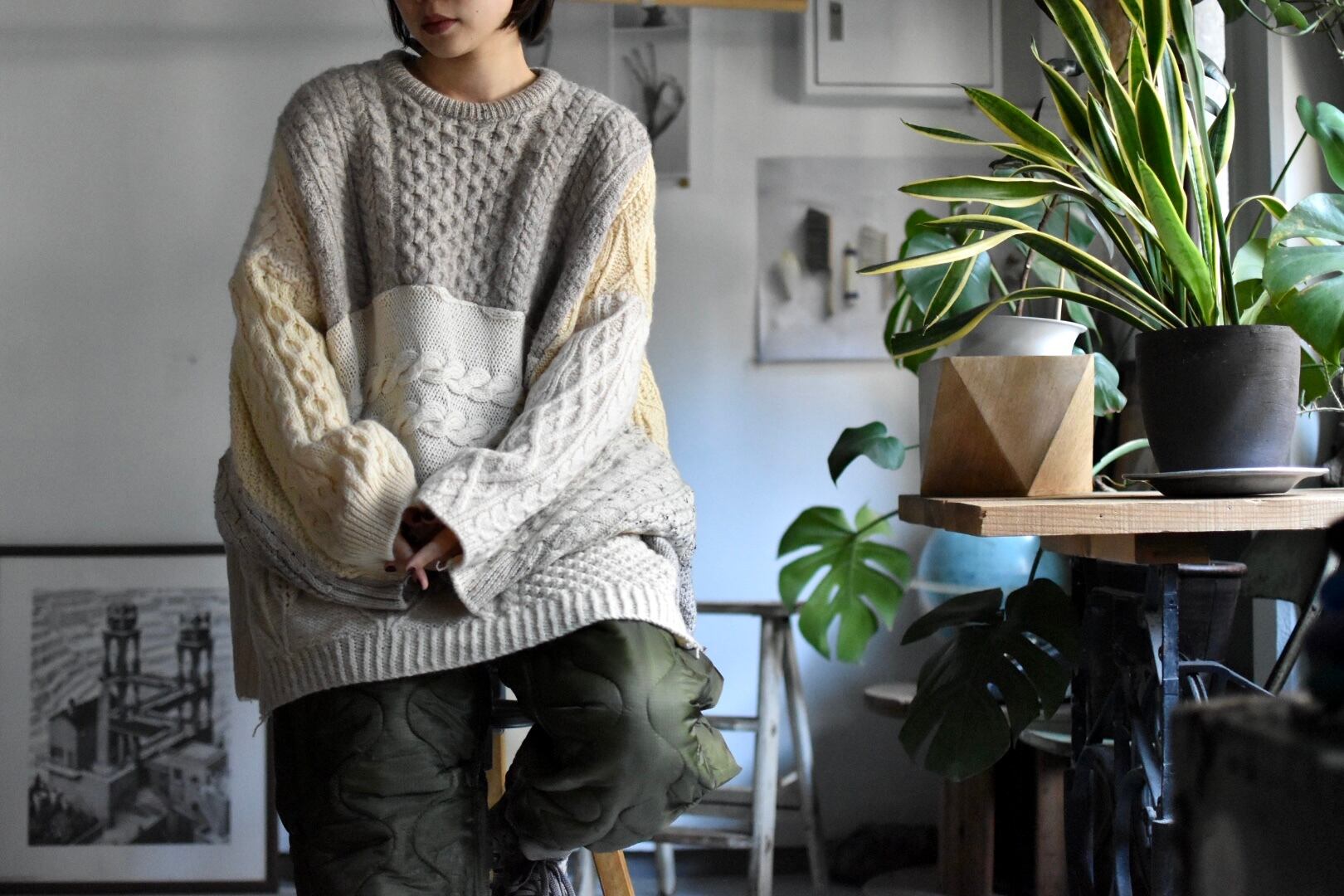 前回はスウェットでしたが、今回はフィッシャーマンニットを素材に使い、贅沢にパッチワークされた至極の一品。