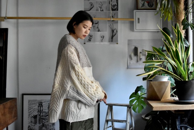 15着のフィッシャーマンニットを解体してつなぎ合わせたというおっかなびっくりなサニーサイドアップさんの定番。