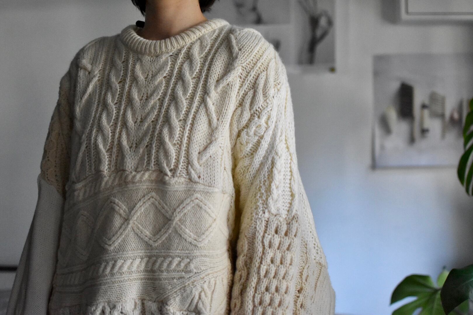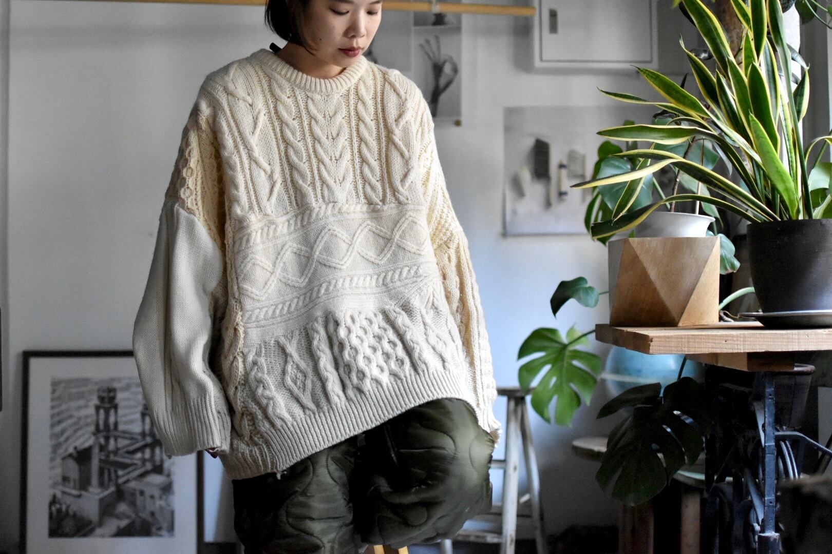 15着のフィッシャーマンニットを解体してつなぎ合わせたというおっかなびっくりなサニーサイドアップさんの定番。