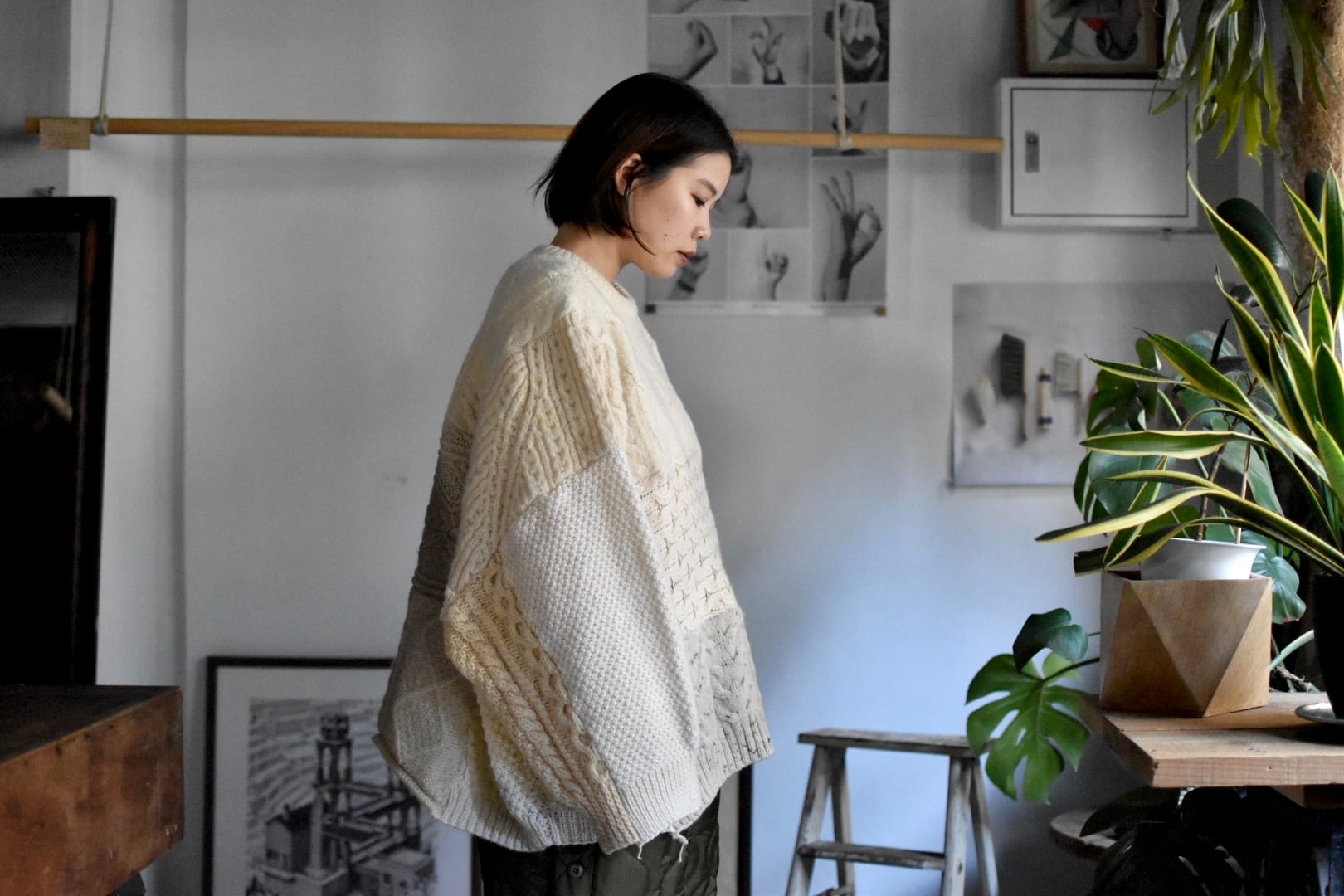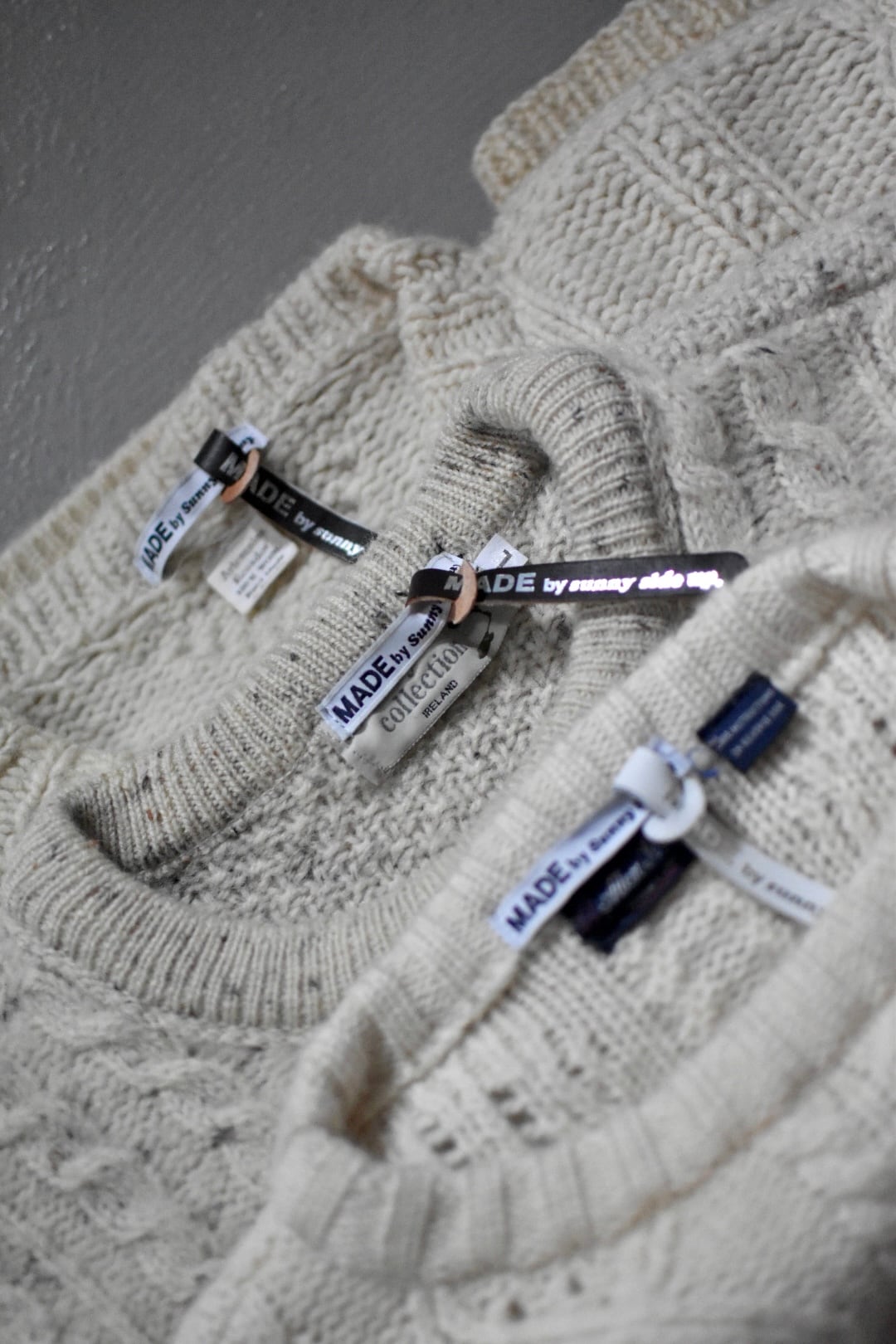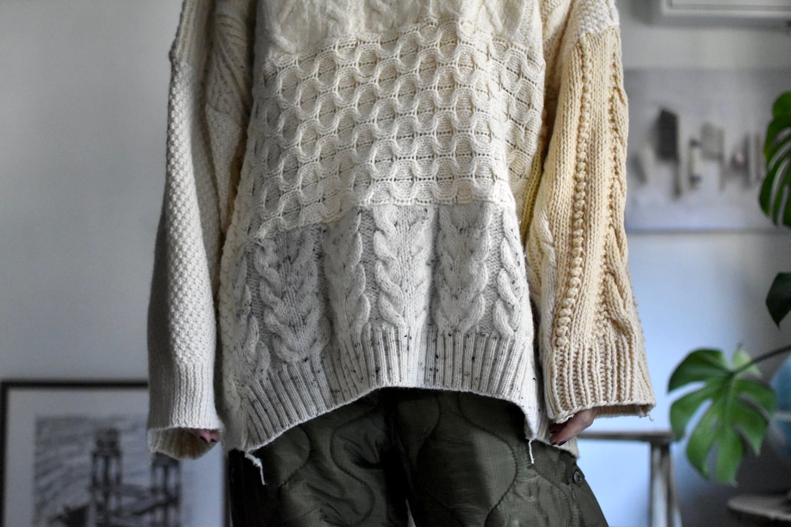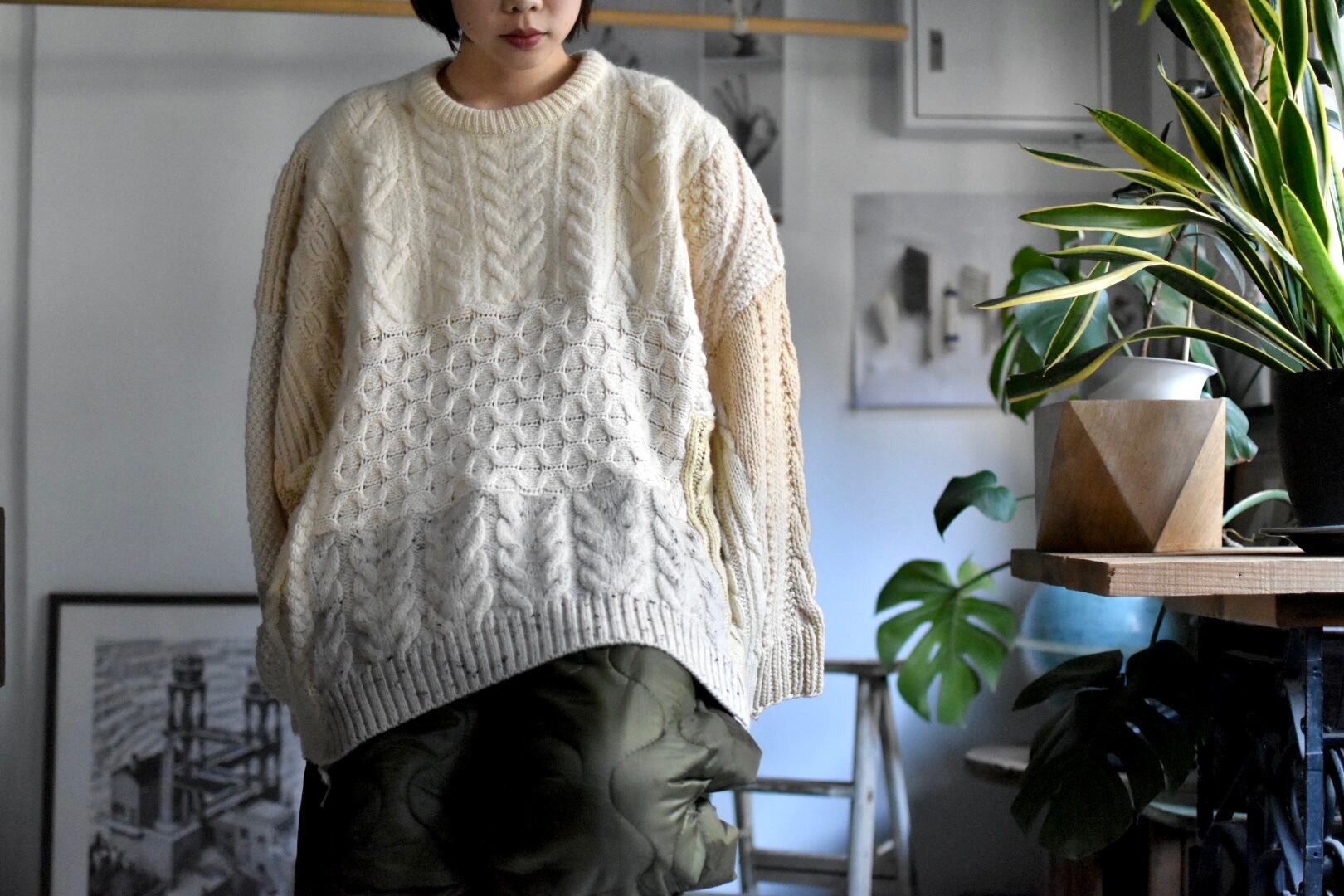 15着のフィッシャーマンニットを解体してつなぎ合わせたというおっかなびっくりなサニーサイドアップさんの定番。