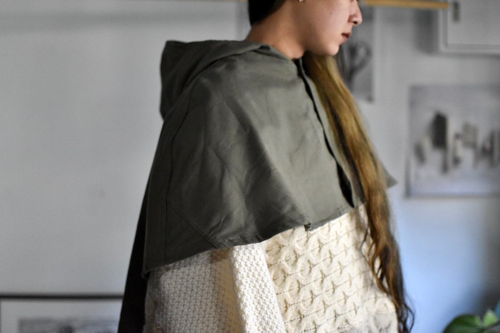 コートやジャケットの中に差し込んで取り付けフードの様にするも良し、そのまま纏うも良し。