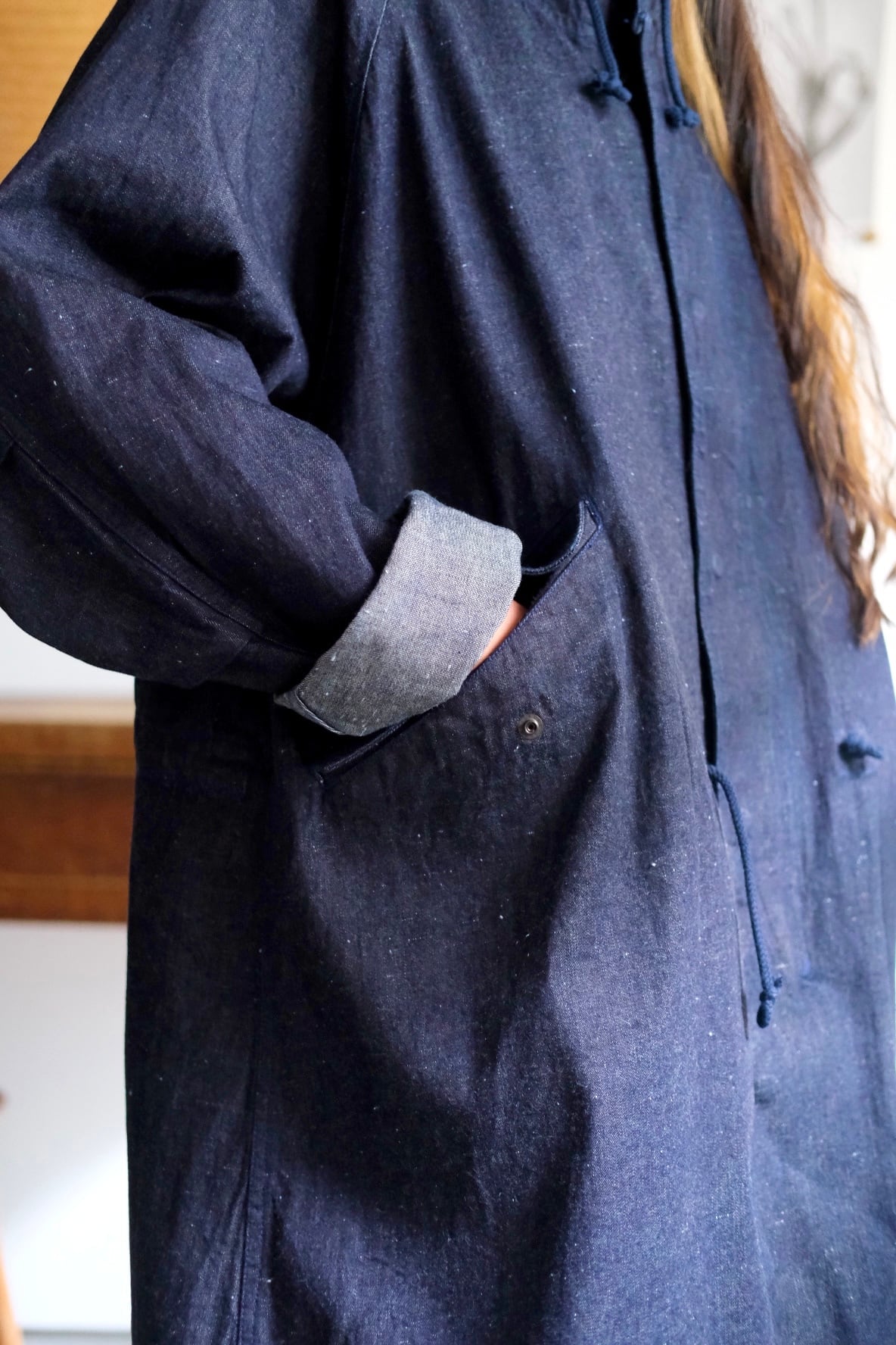 更にラグランスリーブ仕様で作成しているので、インナーダウンなどを着用した時も肩線がなじんでくれるので、秋から冬までしっかりと活躍してくれる一重物のコートになります。