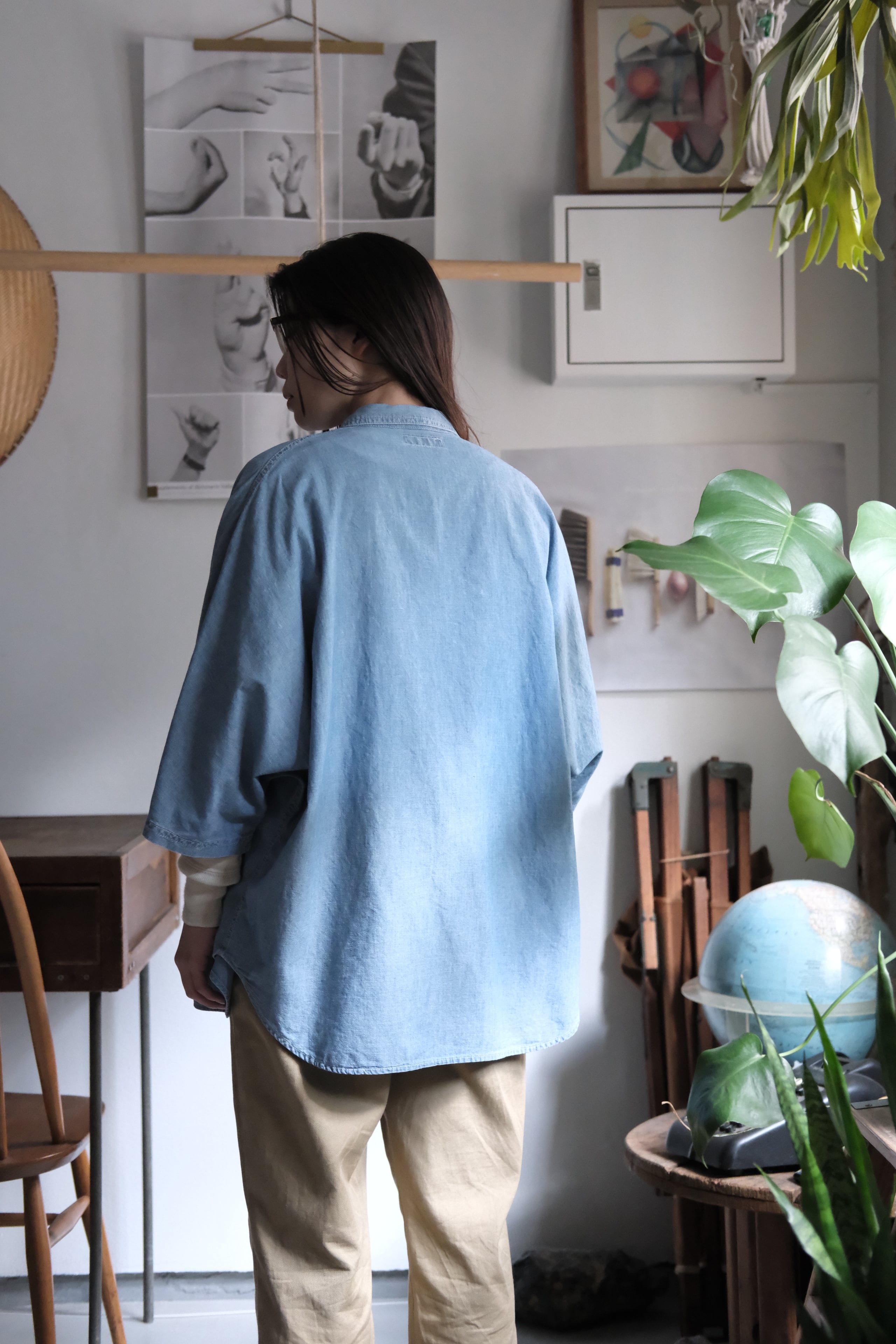 ドルマンスリーブでオーバーシルエットという今のサイズ感に仕上げつつ、アシンメトリーな胸ポケット、小さめの衿などヴィンテージワークシャツのディテールを採用。