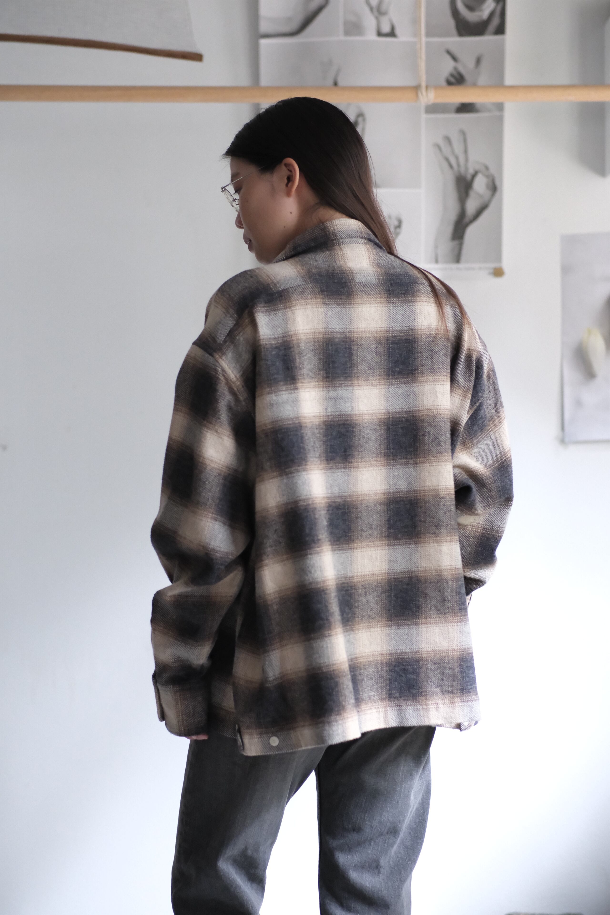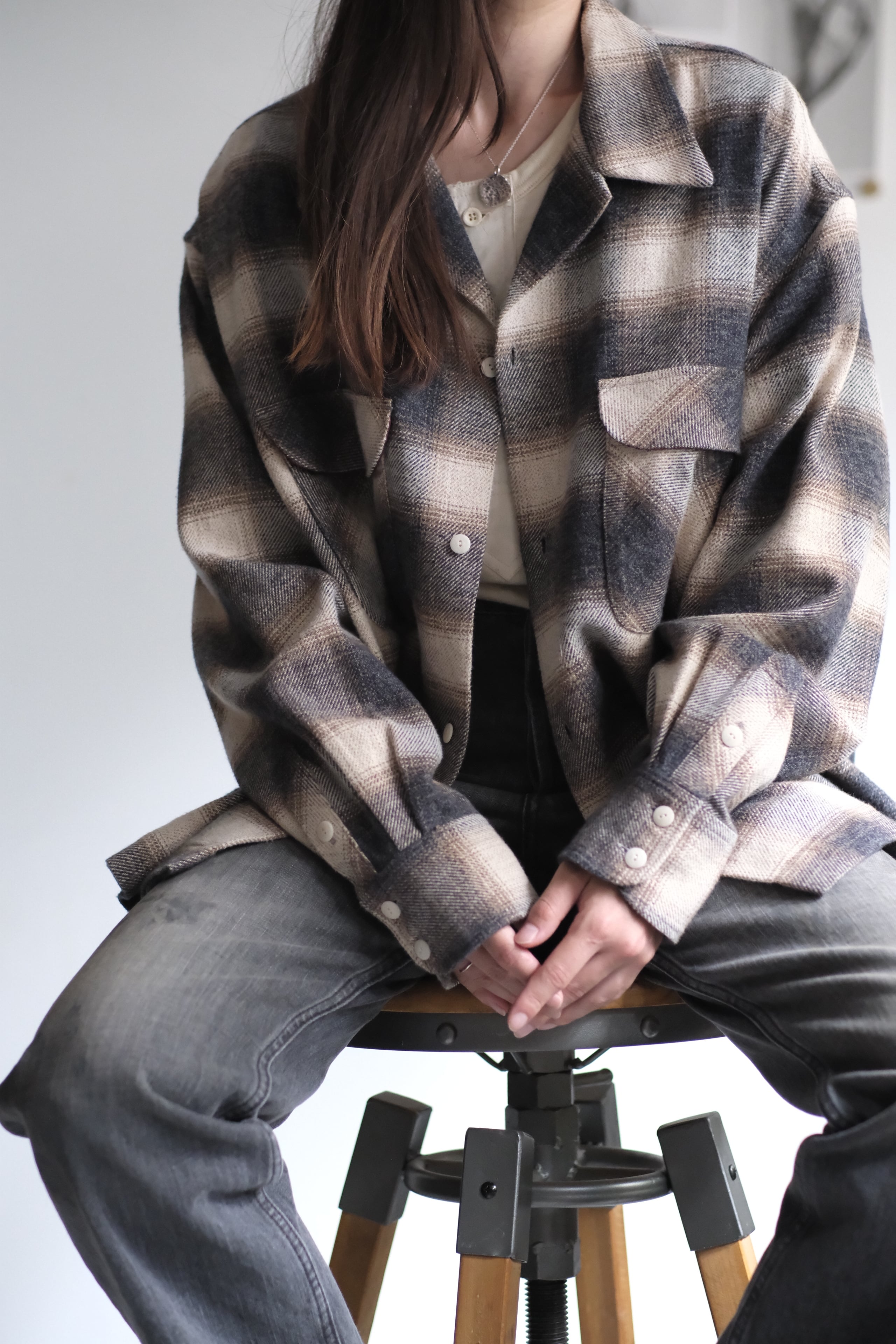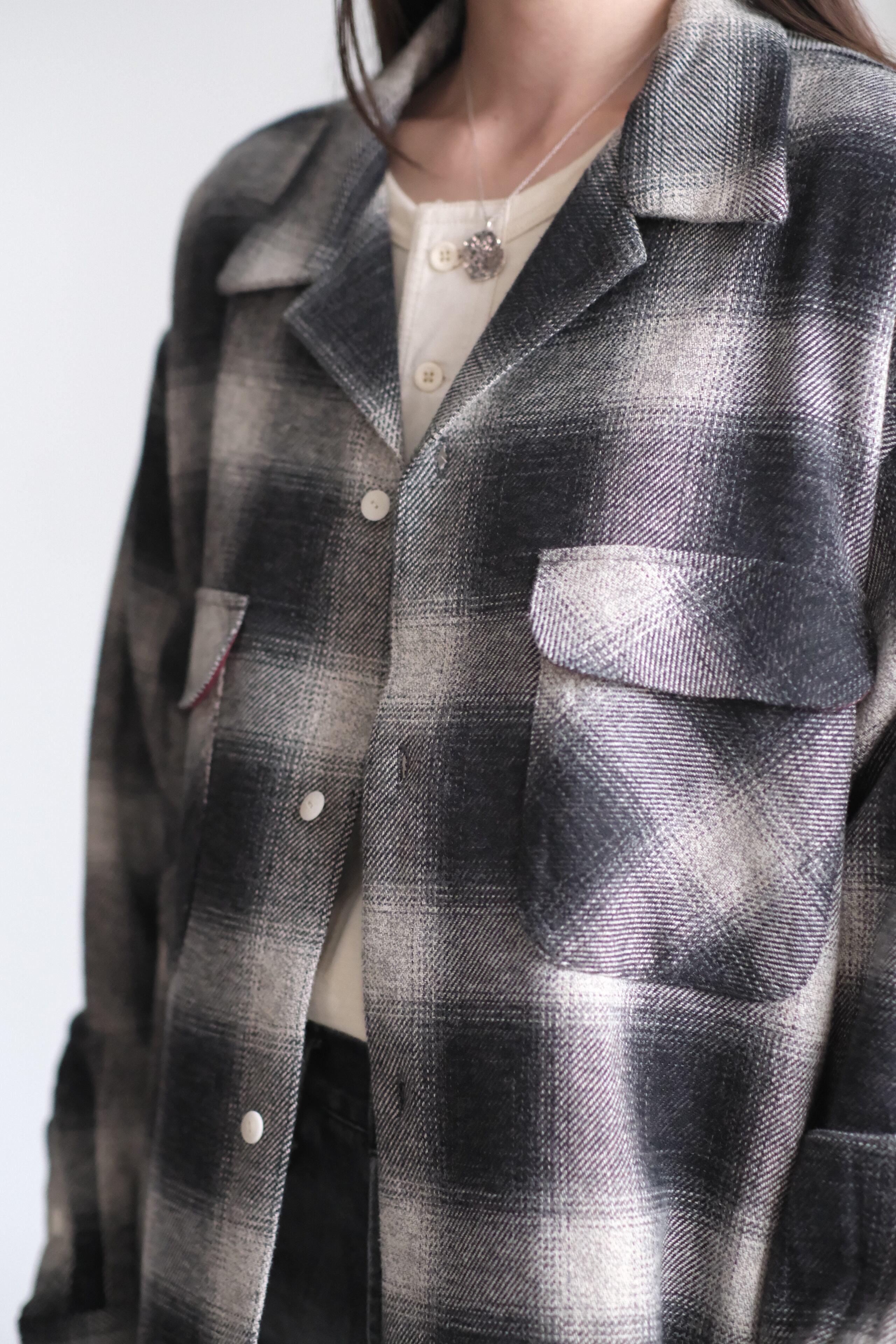 "Ombre check open collar long sleeves shirt"